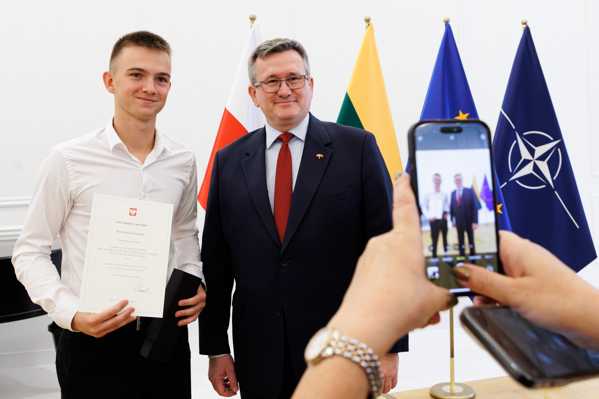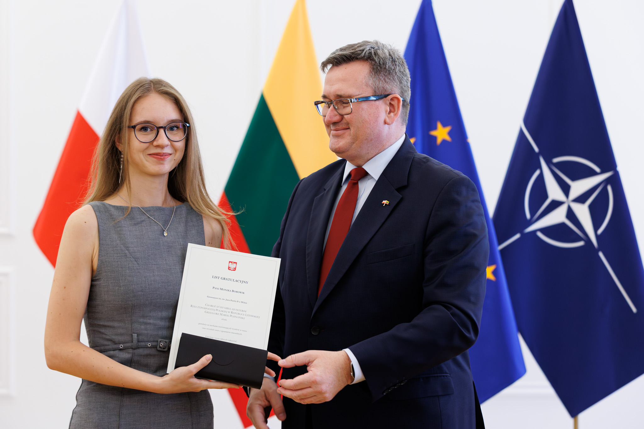 Za szczególne wysokie wyniki w nauce Ambasada RP w Wilnie uhonorowała 60 tegorocznych absolwentów z 27 szkół polskich na Litwie, którym dyplomy i drobne upominki wręczył chargé d'affaires a.i. RP Grzegorz Marek Poznański.