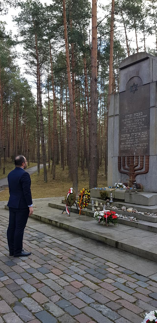Wiceminister Jabłoński odwiedził także memoriał w Ponarach, gdzie złożył kwiaty pod pomnikiem upamiętniającym zamordowanych.