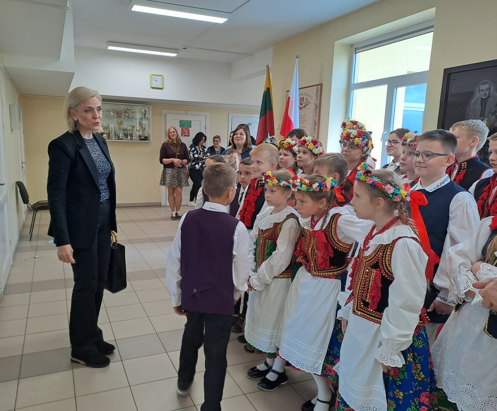 Ministra Mucha odwiedziła trzy placówki edukacyjne - Szkołę Podstawową im. Czesława Miłosza w Pakienie, Liceum Adama Mickiewicza w Wilnie, Gimnazjum im. Longina Komołowskiego w Połukniu. Spotkała się z uczniami, nauczycielami i rodzicami, dziękując im za pielęgnowanie polskiej tradycji, języka i tożsamości.