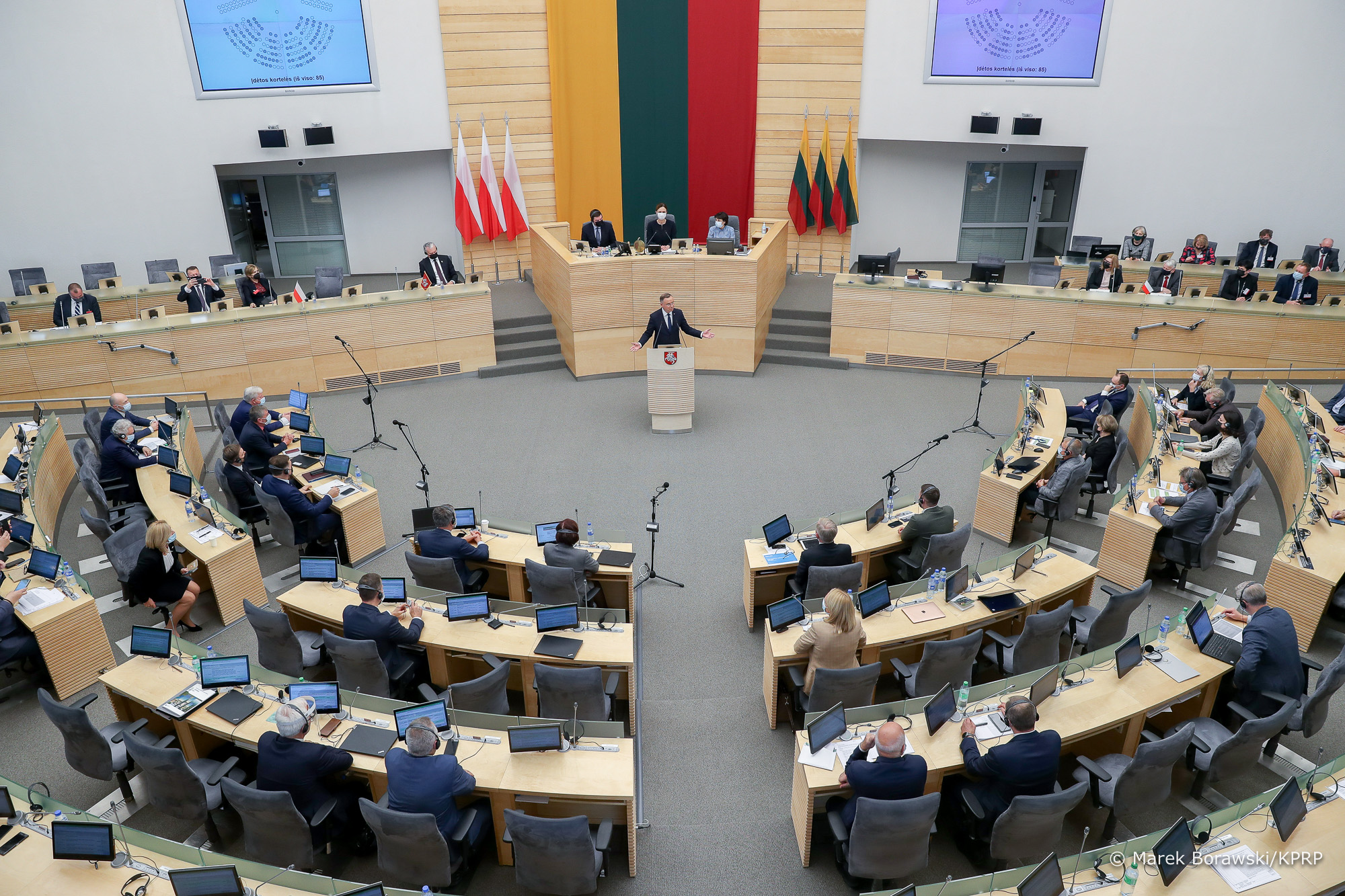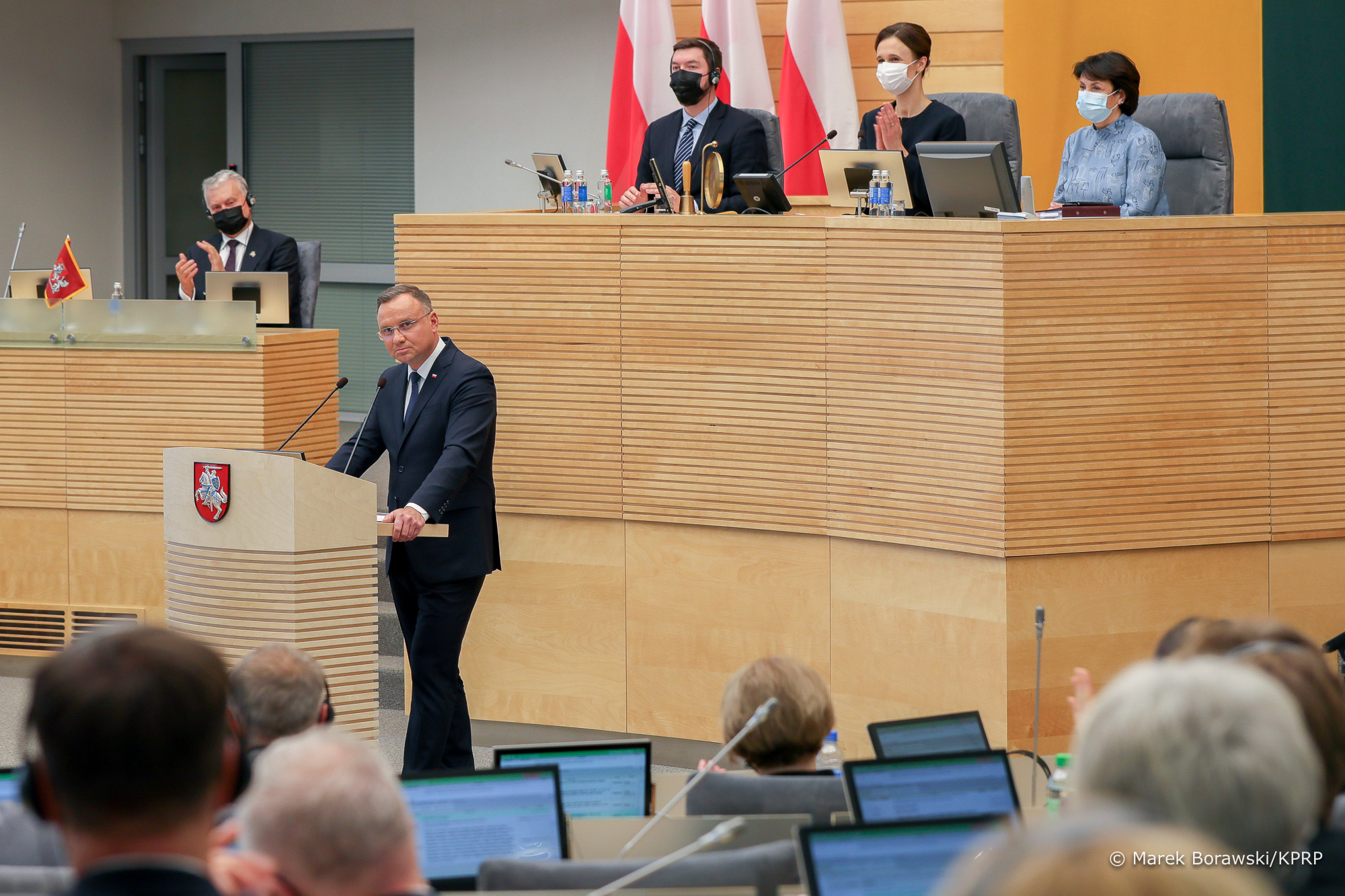 Po południu Andrzej Duda i Gitanas Nausėda wzięli udział w uroczystym posiedzeniu Sejmu RL (Lietuvos Respublikos Seimas) z okazji 230-lecia Zaręczenia Wzajemnego Obojga Narodów. – Dziękuję, że nikomu nie udało się złamać jedności narodów naszego sąsiedztwa. Dziękuję Wam za wsparcie, jakiego wspólnie udzielamy naszym białoruskim braciom – mówił Prezydent RP. Prezydenci rozmawiali także z Przewodniczącą Sejmu Republiki Litewskiej Viktoriją Čmilytė-Nielsen.
