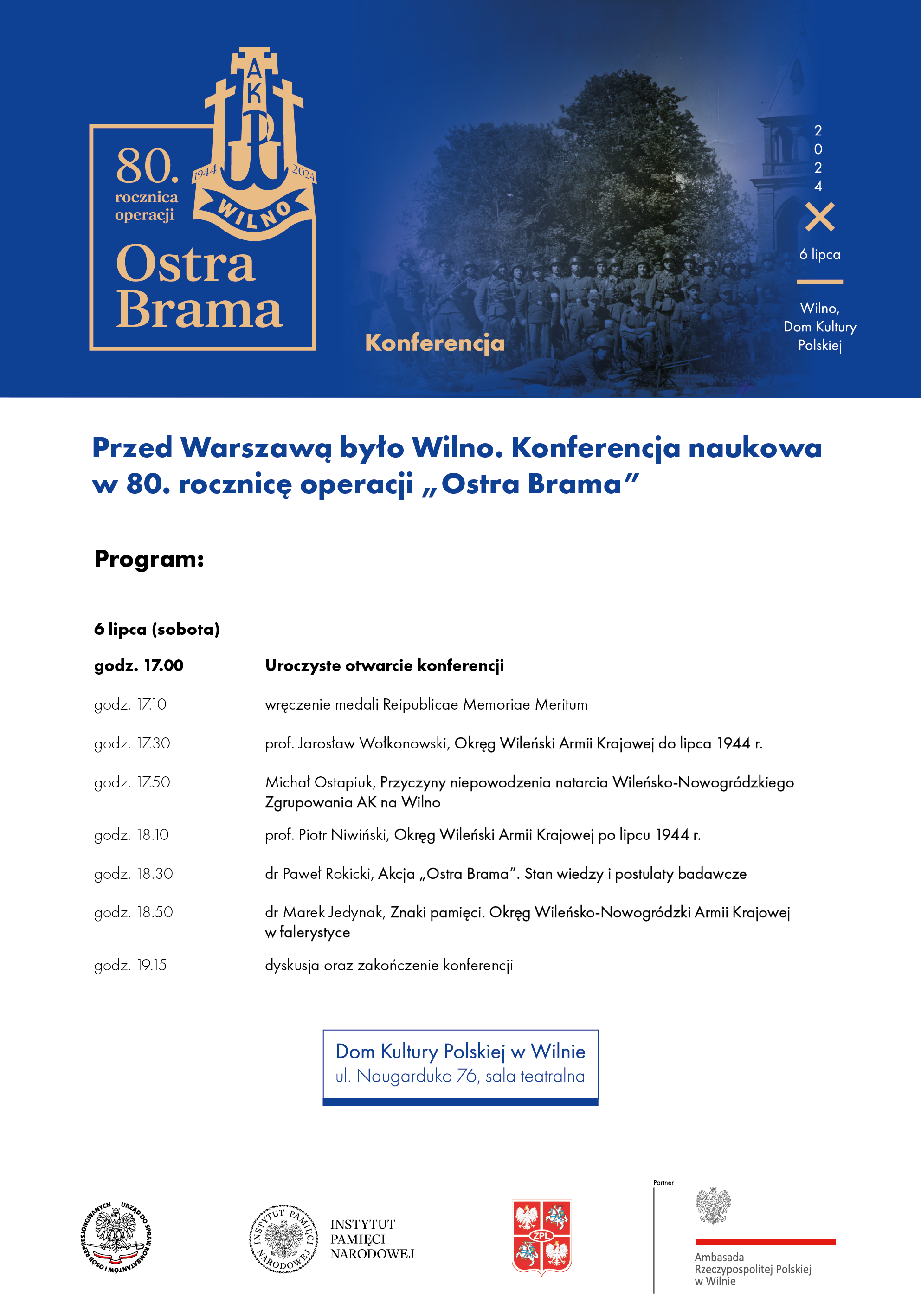 - godz. 17.00 – „Przed Warszawą było Wilno.” Konferencja naukowa w 80. rocznicę operacji „Ostra Brama” w Domu Kultury Polskiej w Wilnie