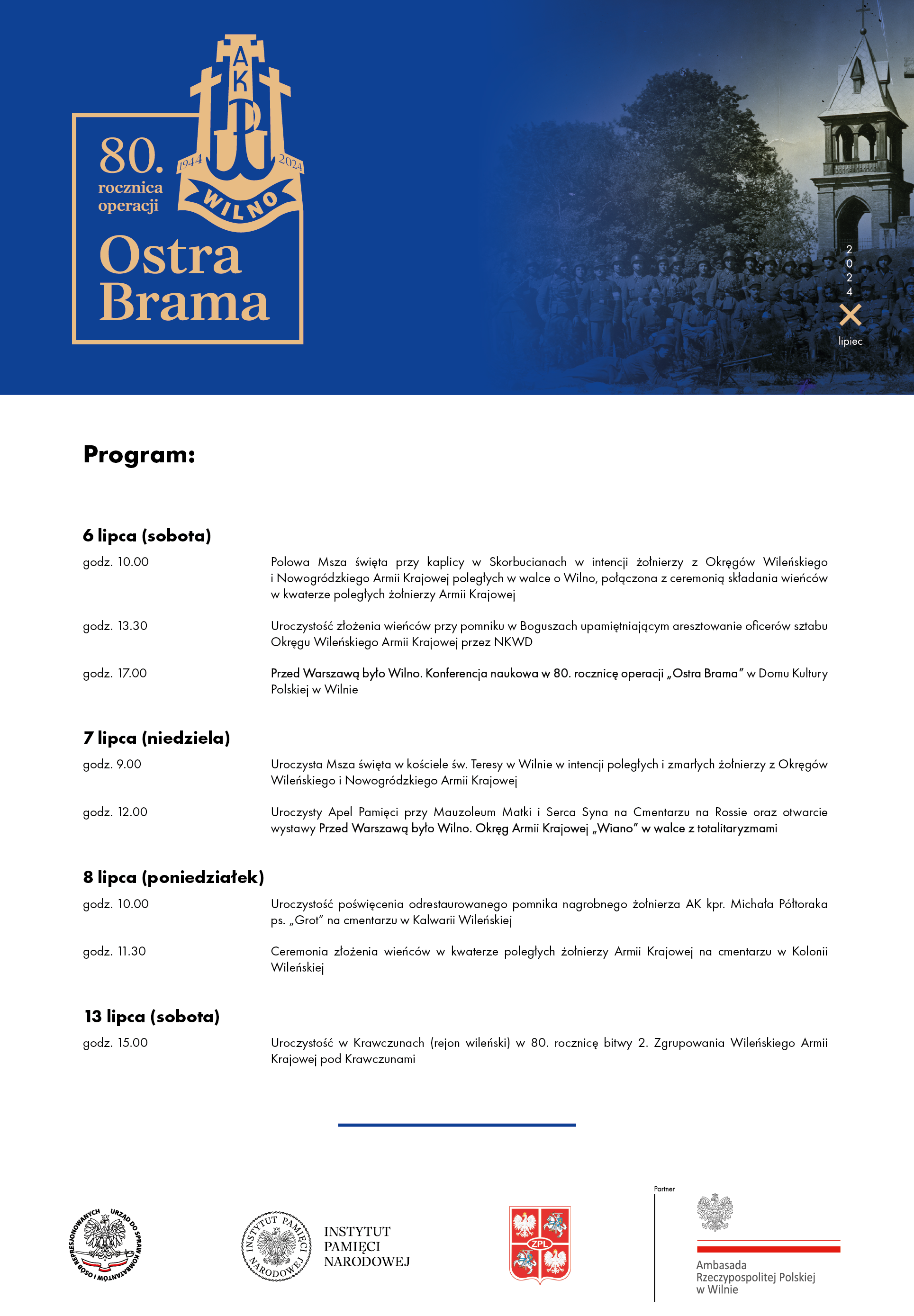 Zapraszamy na uroczyste obchody 80. rocznicy operacji „Ostra Brama”, które odbędą się w dniach 6-8 oraz 13 lipca 2024 r. na Litwie.