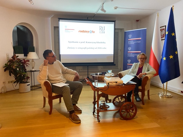 W czwartek 20 listopada 2025 r. Pani Profesor Katarzyna Kłosińska, podczas spotkania w Ambasadzie RP w Luksemburgu, przedstawiła główne założenia reformy ortografii, która wchodzi w życie 1 stycznia 2026 r. Spotkanie zostało zorganizowane we współpracy ze Stowarzyszeniem Rodziców APEEPL oraz Klubem Reja. W spotkaniu wzięli udział nauczyciele i uczniowie ze Szkoły Polskiej im. Marii Skłodowskiej-Curie oraz z sekcji polskiej Szkoły Europejskiej.