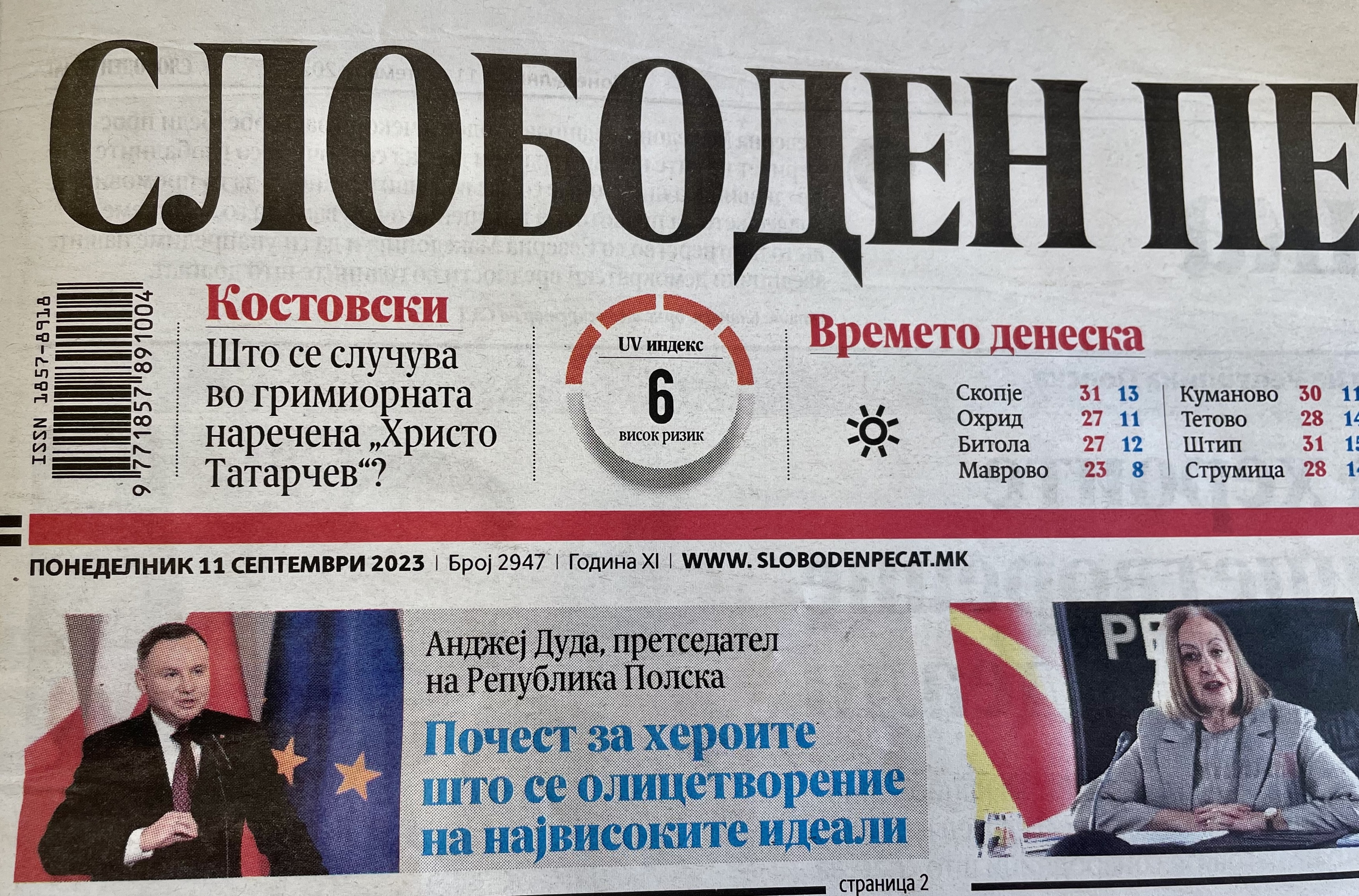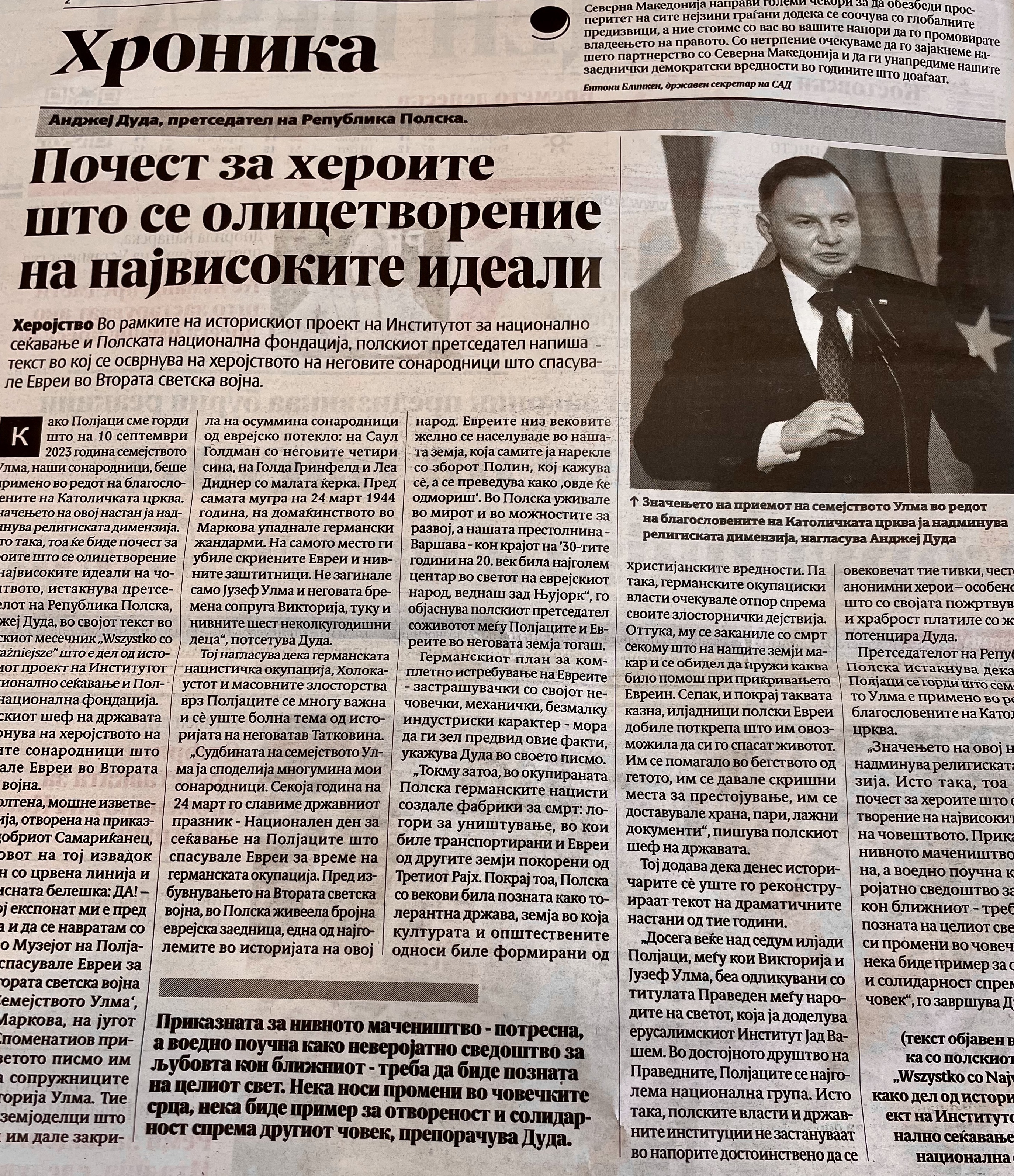 W ramach akcji "Opowiadamy Polskę światu" 12 września br. w macedońskim dzienniku "Sloboden Pecat" zostały opublikowane artykuły Prezydenta RP Andrzeja Dudy „Historia męczeństwa Ulmów powinna być znana na całym świecie” oraz Jana Rokity „Zamordowani za ludzką dobroć”.