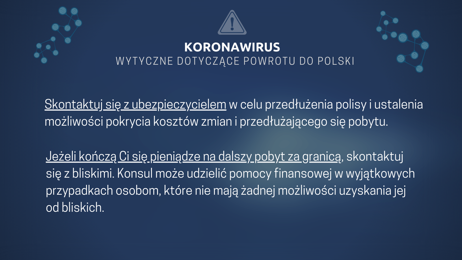 Jeżeli nie masz żadnej możliwości powrotu do Polski, wyślij nam email na adres urzędu <adres urzędu>. Podaj swoje dane osobowe i opisz krótko swoją sytuację oraz miejsce, w którym przebywasz. Jeżeli pojawi się możliwość zorganizowania specjalnych lotów czarterowych do Polski, to poinformujemy Cię o tym.