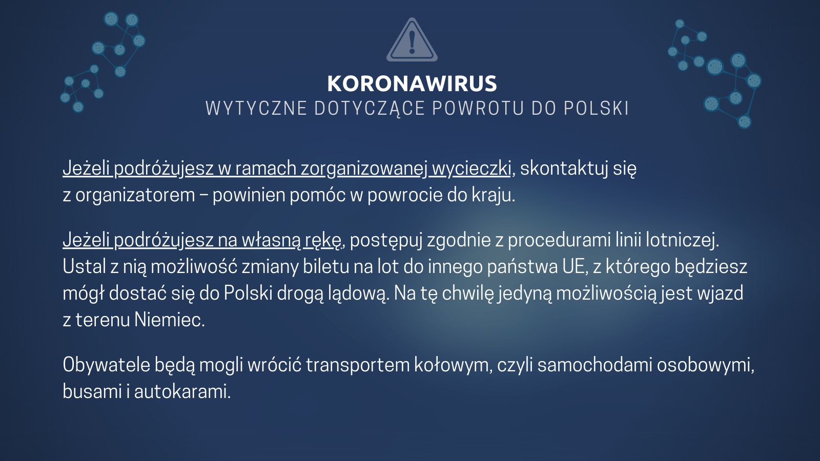 Wszyscy polscy obywatele znajdujący się aktualnie za granicą są uprawnieni do wjazdu na terytorium kraju. Każdy obywatel wracający do Polski zostanie przebadany i skierowany na obowiązkową 14-dniową kwarantannę.