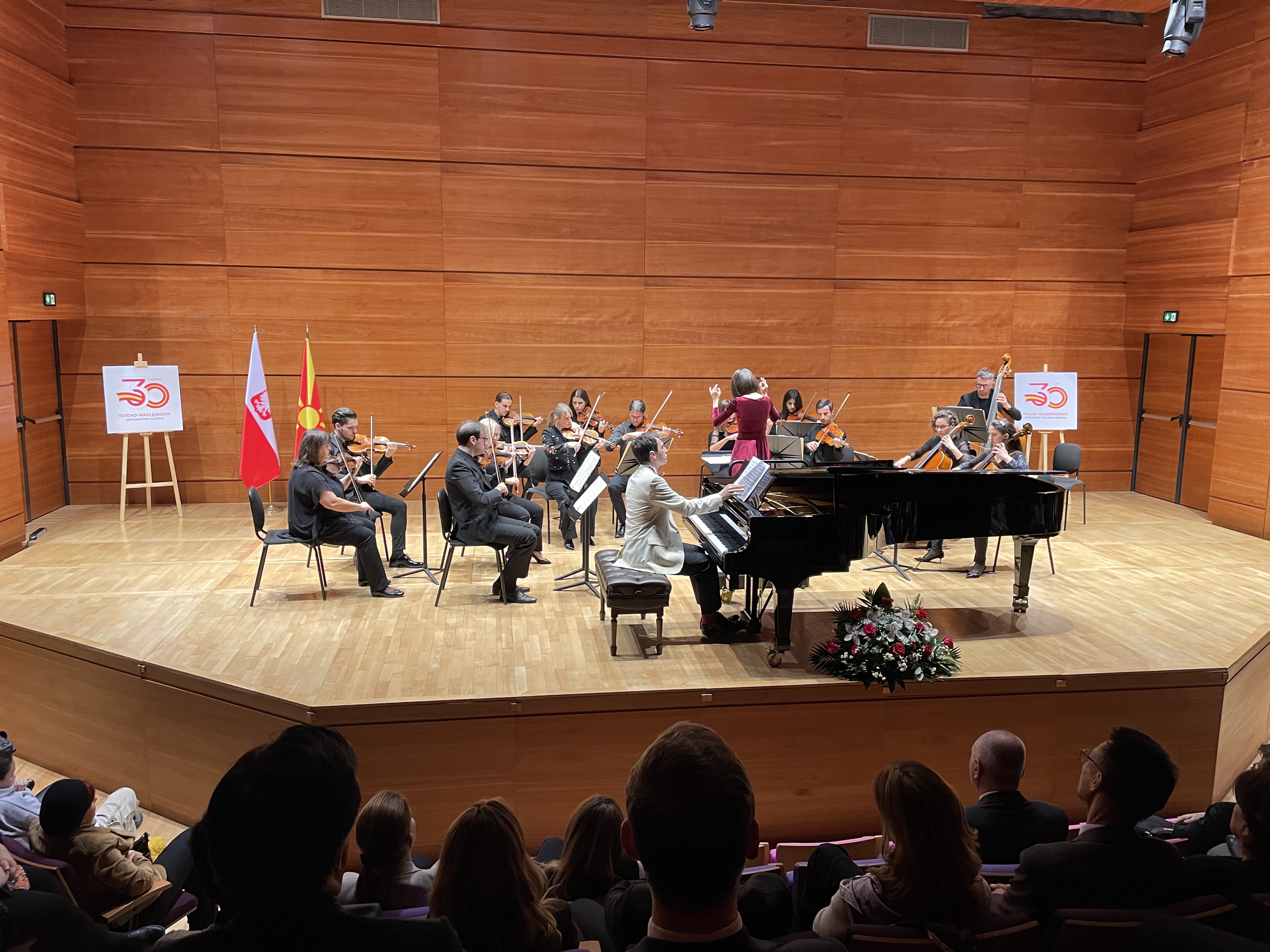 Wydarzenie, w ramach którego rozbrzmiała polska muzyka w wykonaniu znakomitych macedońskich artystów - pianisty Dino Imeriego i Orkiestry Kameralnej ID pod batutą Dijany Imeri Ilkoskiej, uczciło przypadającą w tym roku 30. rocznicę polsko-macedońskich stosunków dyplomatycznych. W programie znalazły się: Ballada nr 1 g-moll, op. 23, Preludia e-moll nr 4 i fis-moll nr 8, op.28, Walc nr 2 cis-moll, op.64, Walc Des-dur nr 1 „minutowy”, op.64, Polonez As-dur „Heroiczny”, op. 53 oraz II Koncert f-moll op. 21 na fortepian i orkiestrę.