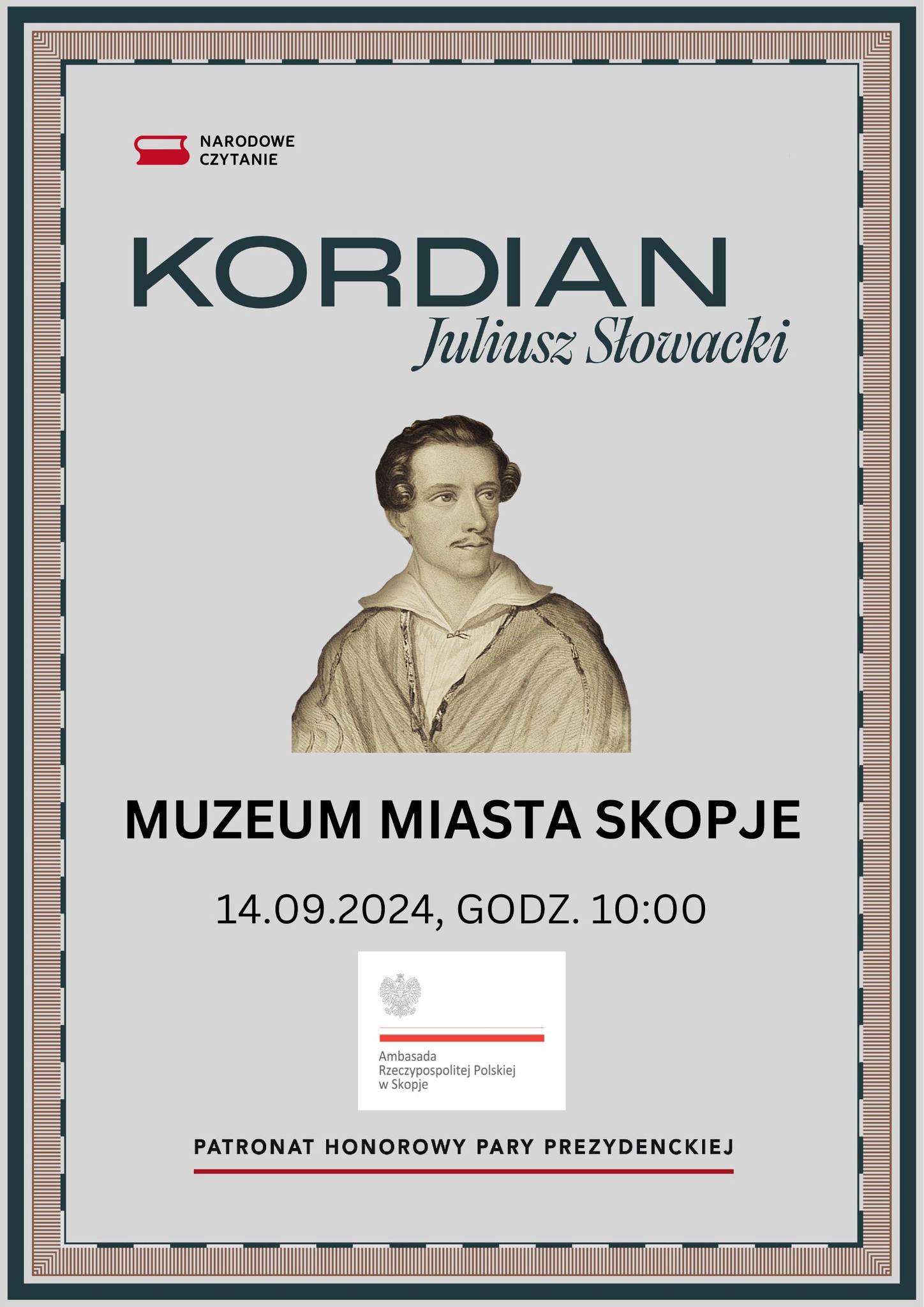 14 września br. Ambasada RP w Skopje zorganizowała 2. edycję Narodowego Czytania, wydarzenia organizowanego od 2012 r. pod patronatem honorowym Pary Prezydenckiej. Podczas tegorocznej odsłony, w Muzeum Miasta Skopje, odbyło się wspólne czytanie "Kordiana" Juliusza Słowackiego. W programie znajdowała się wyjątkowa inscenizacja monologu Kordiana na szczycie Mont Blanc w wykonaniu studenta polonistyki Uniwersytetu Św. Cyryla i Metodego w Skopje oraz wspólne czytanie fragmentów utworu przez wszystkich chętnych. Do akcji włączyły się także dzieci ze szkółki polonijnej w Skopje.