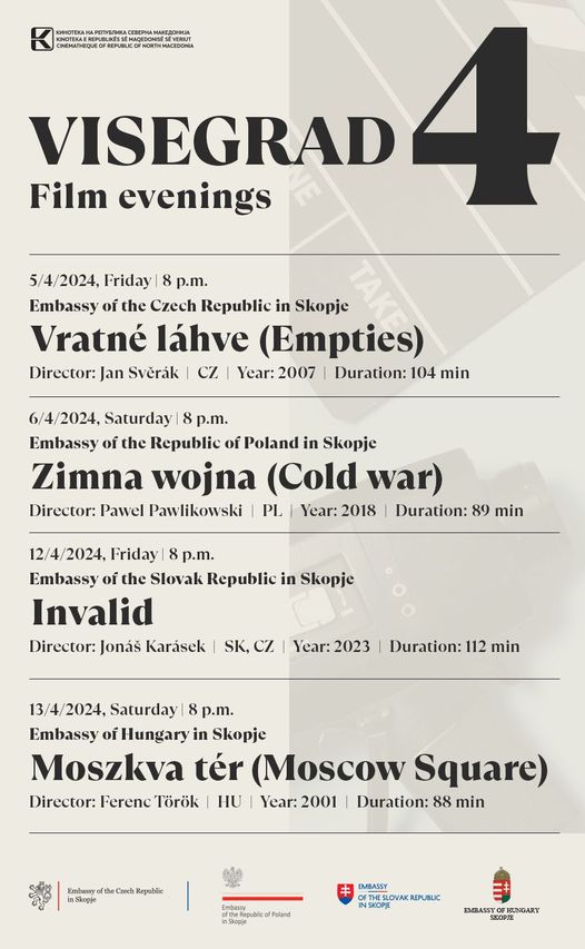 W sobotę 6 kwietnia w skopijskiej Kinotece odbyło się uroczyste otwarcie przeglądu filmów państw Grupy Wyszehradzkiej z udzialem Ambasadorów V4. Następnego dnia - w niedzielę 7 kwietnia - miała miejsce projekcje "Zimna wojna" w reżyserii Pawła Pawlikowskiego. W przyszły piątek i sobotę zapraszamy na film słowacki i węgierski.