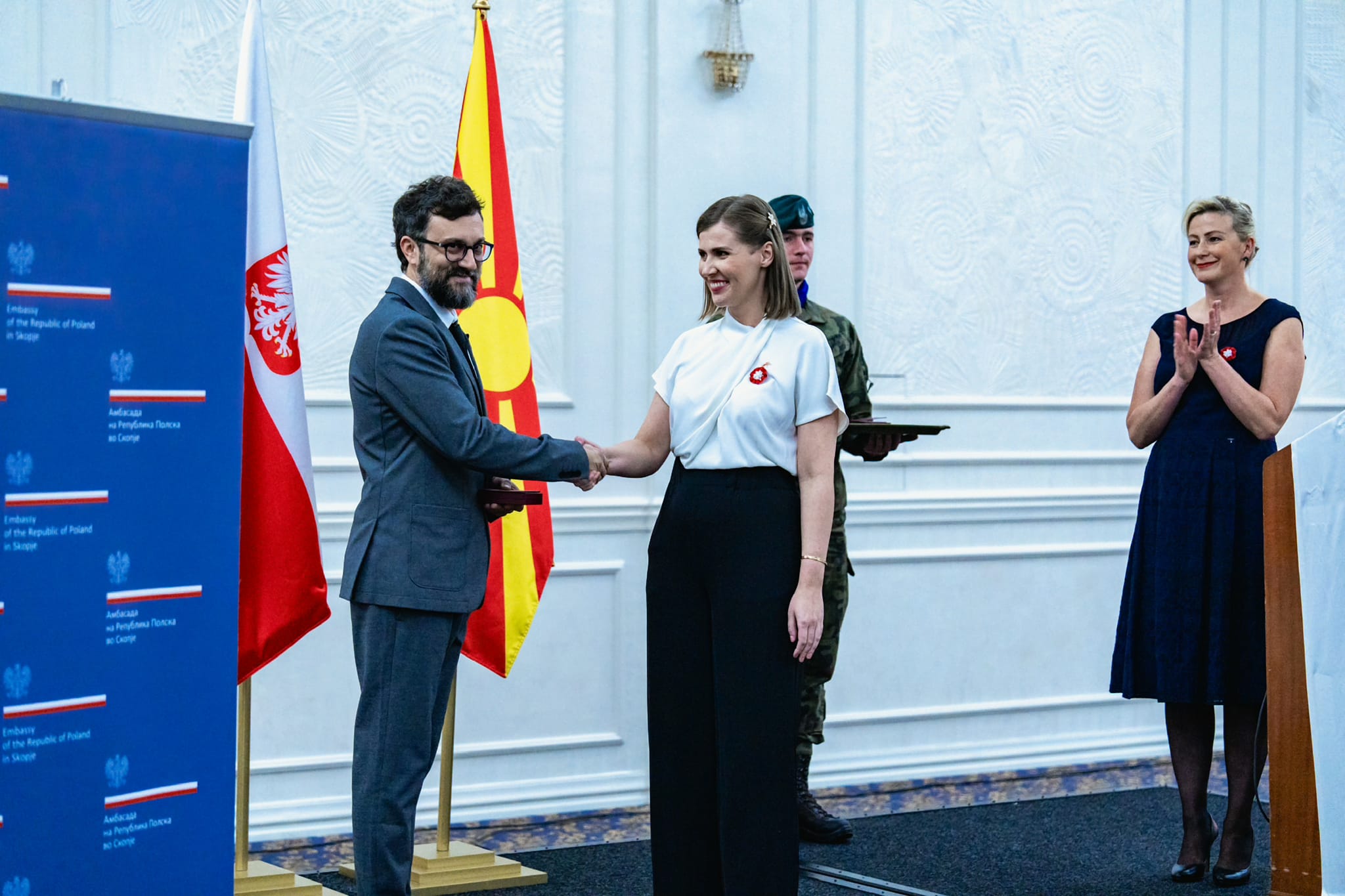 Podczas przyjęcia zostały wręczone odznaczenia nadane przez Prezydenta RP: Krzyż Kawalerski Orderu Zasługi RP dla Pani Lidiji Tanuševskiej oraz Złote Krzyże Zasługi dla Pana Filipa Dimevskiego i dla Pani Natalii Łukomskiej. Wszystkie odznaczenia zostały nadane za promowanie literatury polskiej. Asystę wojskową z tej okazji zapewnił PKW KFOR.