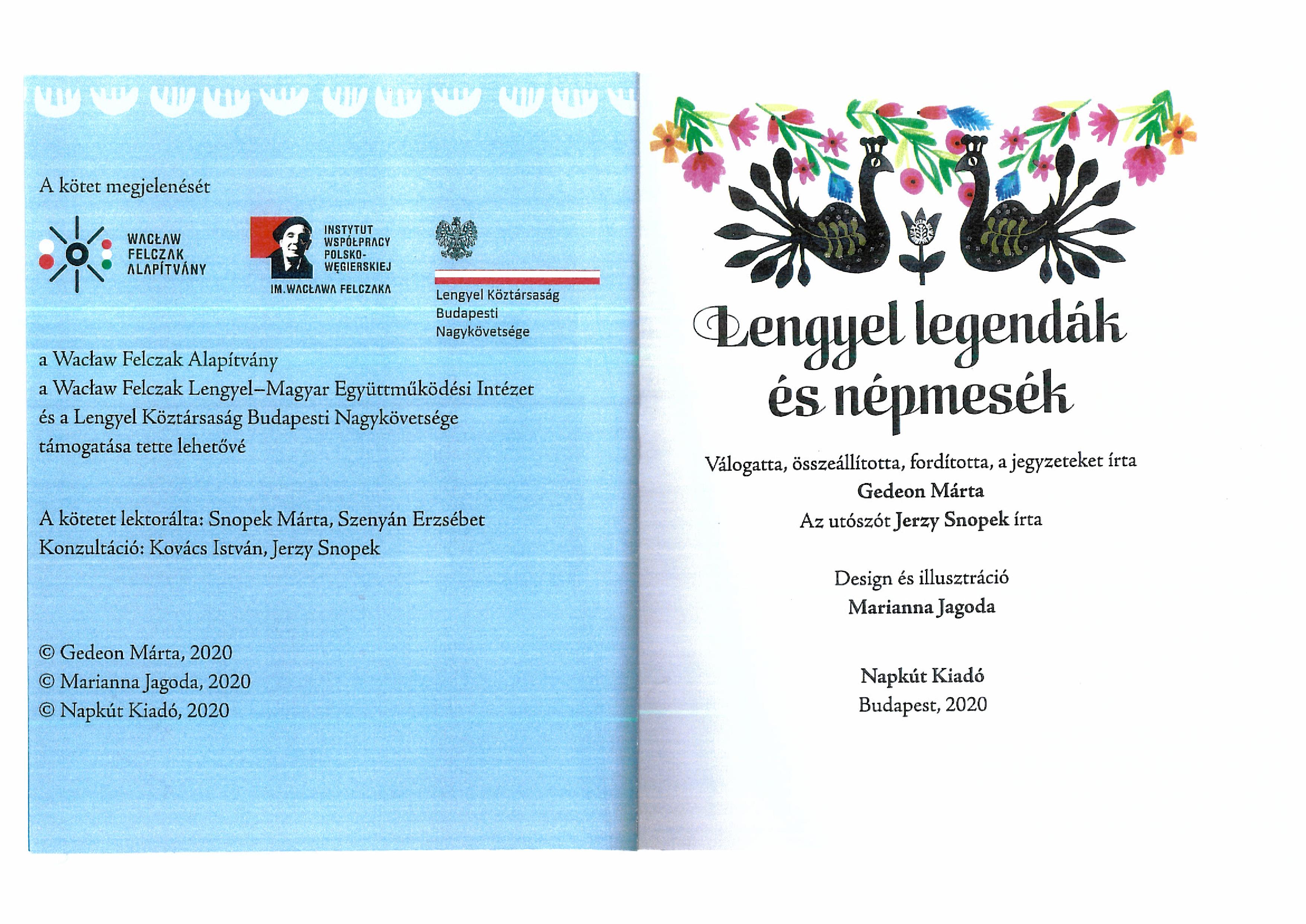 2020 decemberében a Nagykövetség kezdeményezése által a Napkút Kiadó gondozásában megjelent két kiadvány. Az első, Marianna Jagoda gyönyörű illusztrációival a Lengyel legendák és népmesék címet viseli. A könyv Gedeon Márta összeállításában és fordításában jelent meg, az utószót Jerzy Snopek írta. A kiadást anyagilag támogatta a magyar Wacław Felczak Alapítvány és a lengyel Wacław Felczak Lengyel-Magyar Együttműködési Intézet.