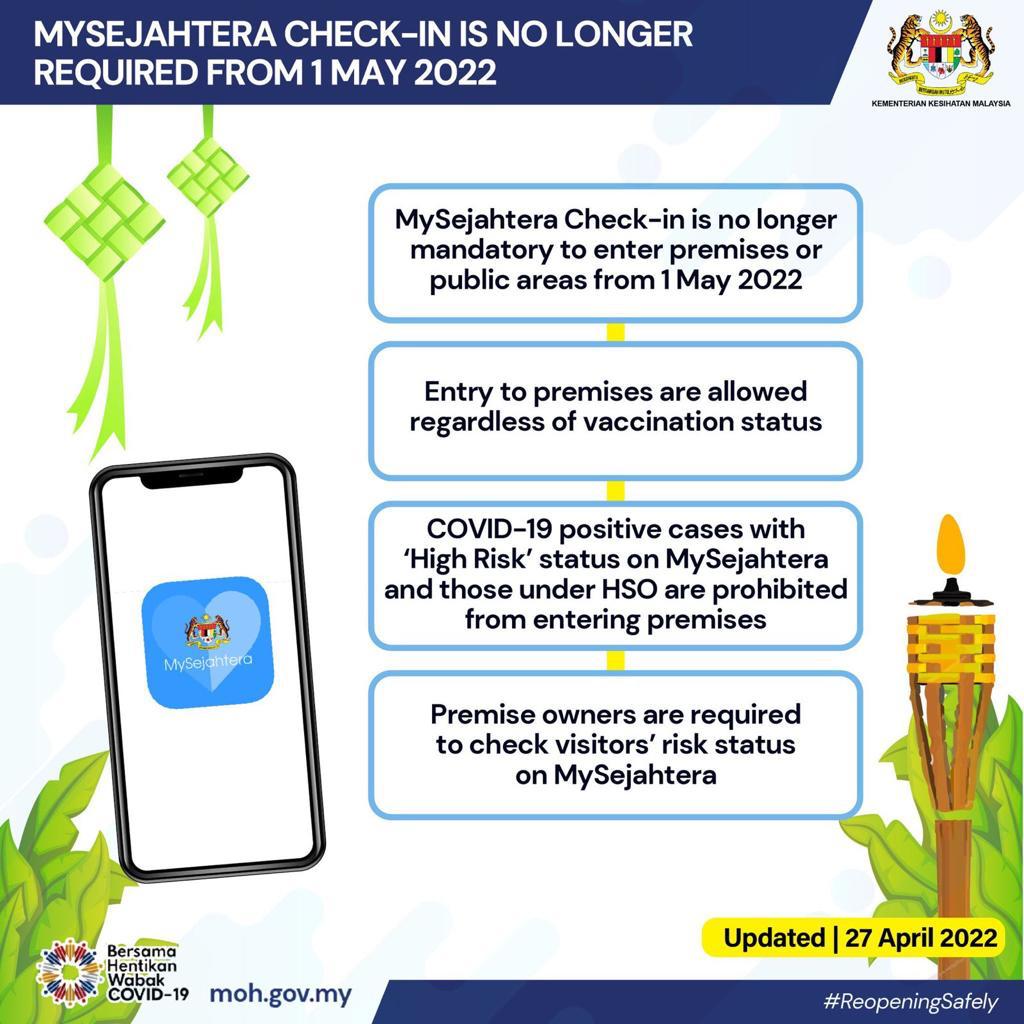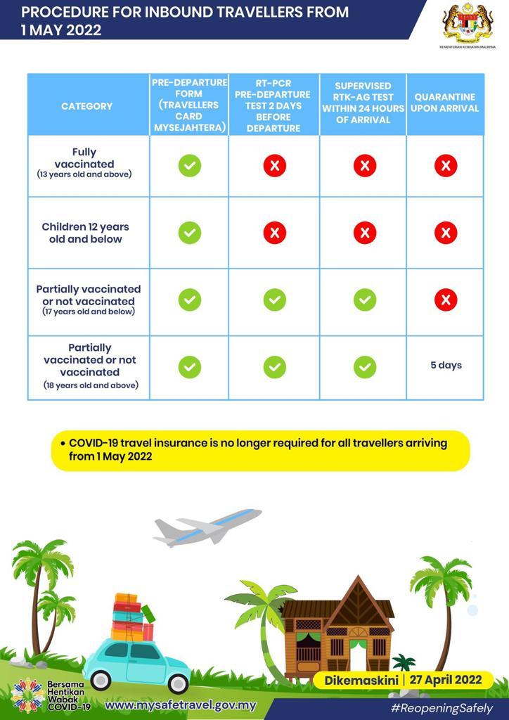 Z dniem 1 maja 2022 r. osoby przyjeżdżające do Malezji, będące w pełni zaszczepione oraz dzieci w wieku do 12 lat, zostały zwolnione z konieczności odbycia kwarantanny oraz wykonywania testów przed i po przylocie na obecność COVID-19. Od 1 sierpnia 2022 zniesiono również konieczność wypełnienia deklaracji o podróży (travellers card MySejahtera) w aplikacji MySejahtera przed przylotem do Malezji.