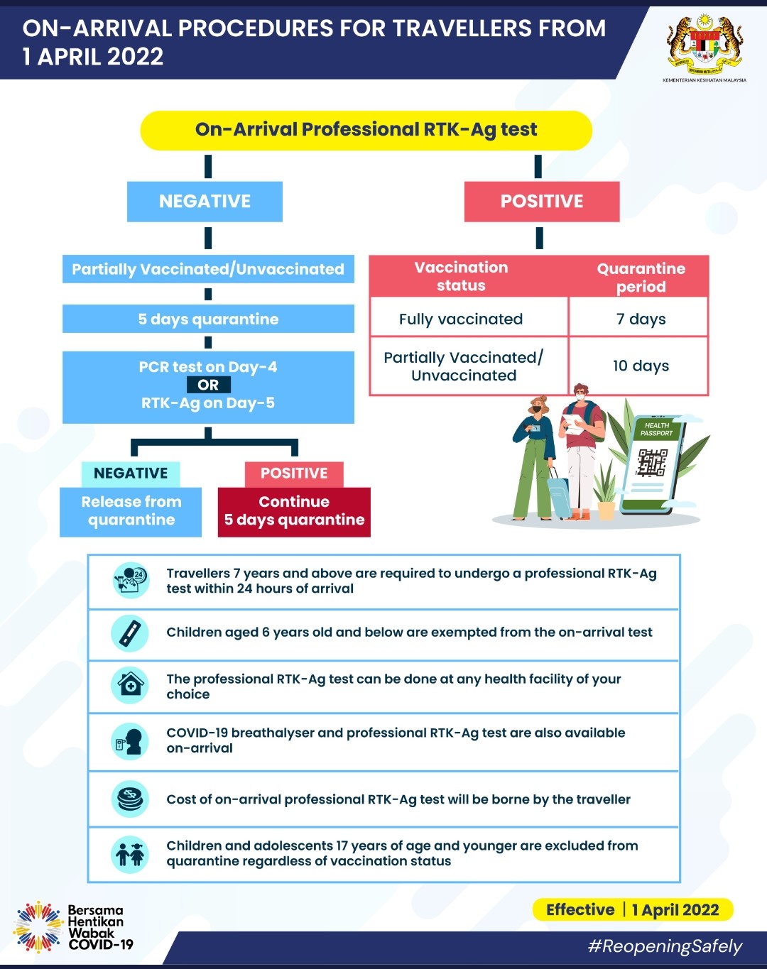 Osoby przyjeżdżające do Malezji, będące w pełni zaszczepione, zostaną zwolnione z konieczności odbycia kwarantanny pod warunkiem okazania negatywnego testu PCR wykonanego na dwa dni przed wylotem do Malezji i uzyskaniu negatywnego wyniku profesjonalnego test RTK-Ag, wykonanego w przeciągu 24 godzin od przylotu do Malezji. Test ten można wykonać na lotnisku bezpośrednio po przylocie lub po przekroczeniu granicy. Dzieci w wieku poniżej 7 lat zwolnione są z obowiązku wykonywania testu po przylocie.
