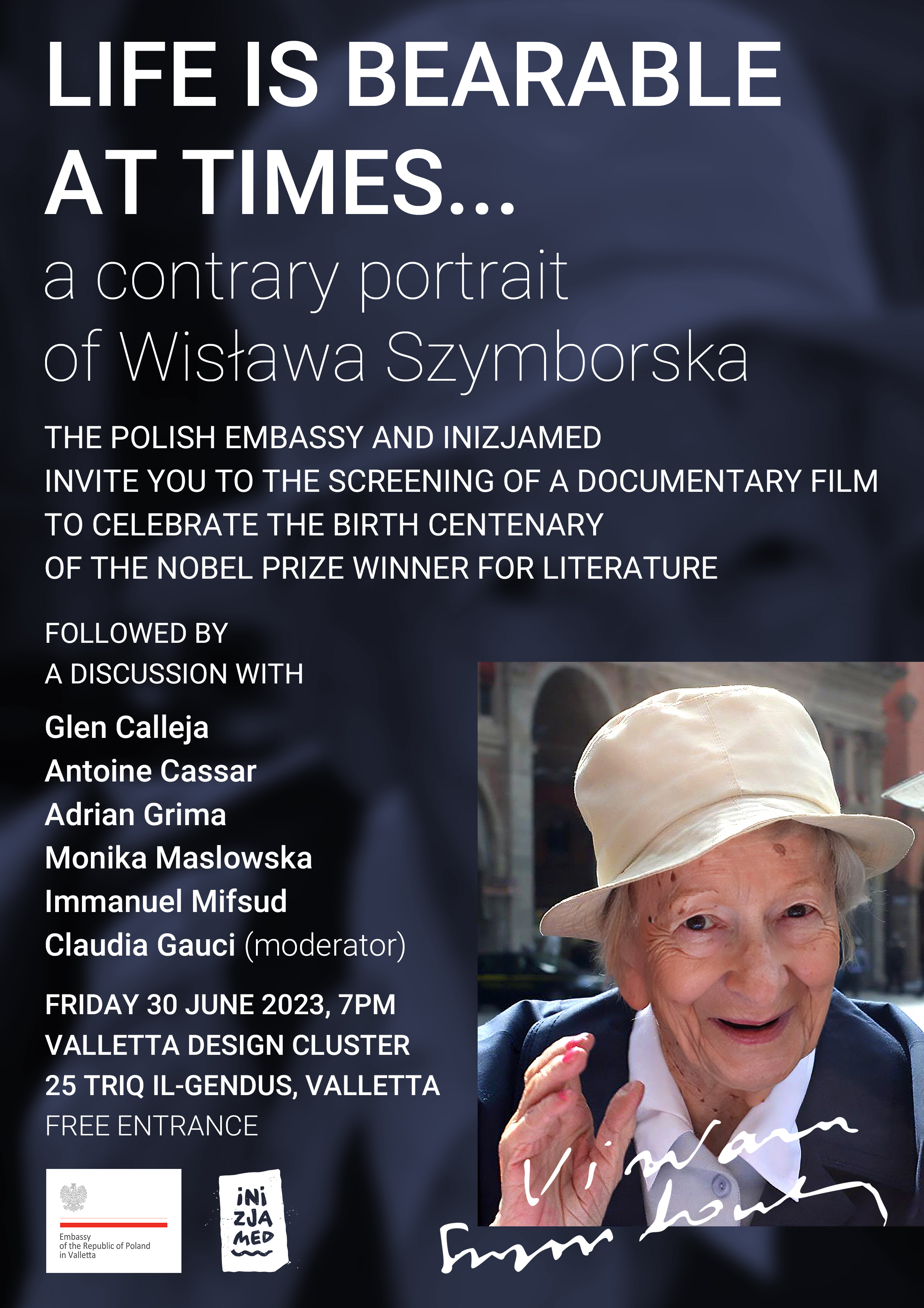 30 czerwca, w ramach obchodów 100. rocznicy urodzin W. Szymborskiej na Malcie, w centrum kultury Valletta Design Cluster zaprezentowano film dokumentalny pt. „Chwilami życie bywa znośne” w reż. K. Kolendy-Zaleskiej, poświęcony polskiej noblistce. Po projekcji filmu odbyła się dyskusja panelowa na temat twórczości W. Szymborskiej oraz jej recepcji na Malcie.