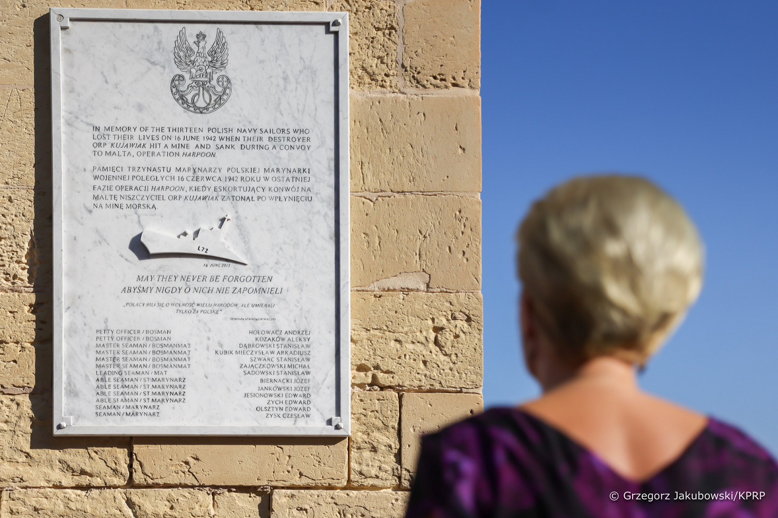 6 października w Ogrodach Upper Barrakka Małżonka Prezydenta RP razem z polskimi dziećmi mieszkającymi na Malcie złożyła wieniec przed tablicą upamiętniającą zatopiony w czasie II wojny światowej niszczyciel ORP "Kujawiak" oraz zmarłych na skutek tego wydarzenia polskich marynarzy.
