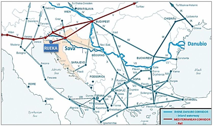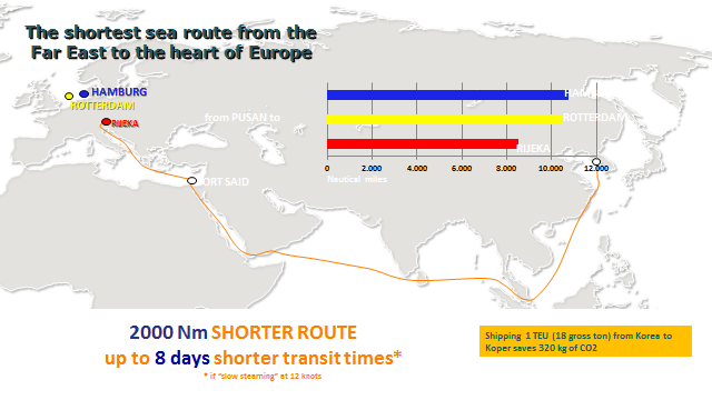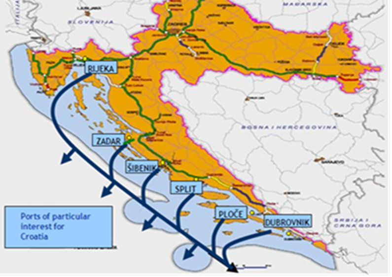 Zamiarem Chorwacji jest zwiększenie wykorzystania potencjału portów morskich i odegranie ważnej roli w transporcie towarów między Europą a Azją. Mimo że co roku przez Kanał Sueski przepływa przez niego 800 milionów ton ładunków w ramach wymiany towarowej między Europą, Azją i Australią, tylko około 40 milionów ton jest w rzeczywistości kierowanych do północnych portów Adriatyku. Jest to ogromna szansa dla naszych portów, w szczególności dla portu w Rijece jako części korytarza śródziemnomorskiego, jako że jest on w sprawiedliwy sposób połączony z główną siecią kolejową i autostradową.