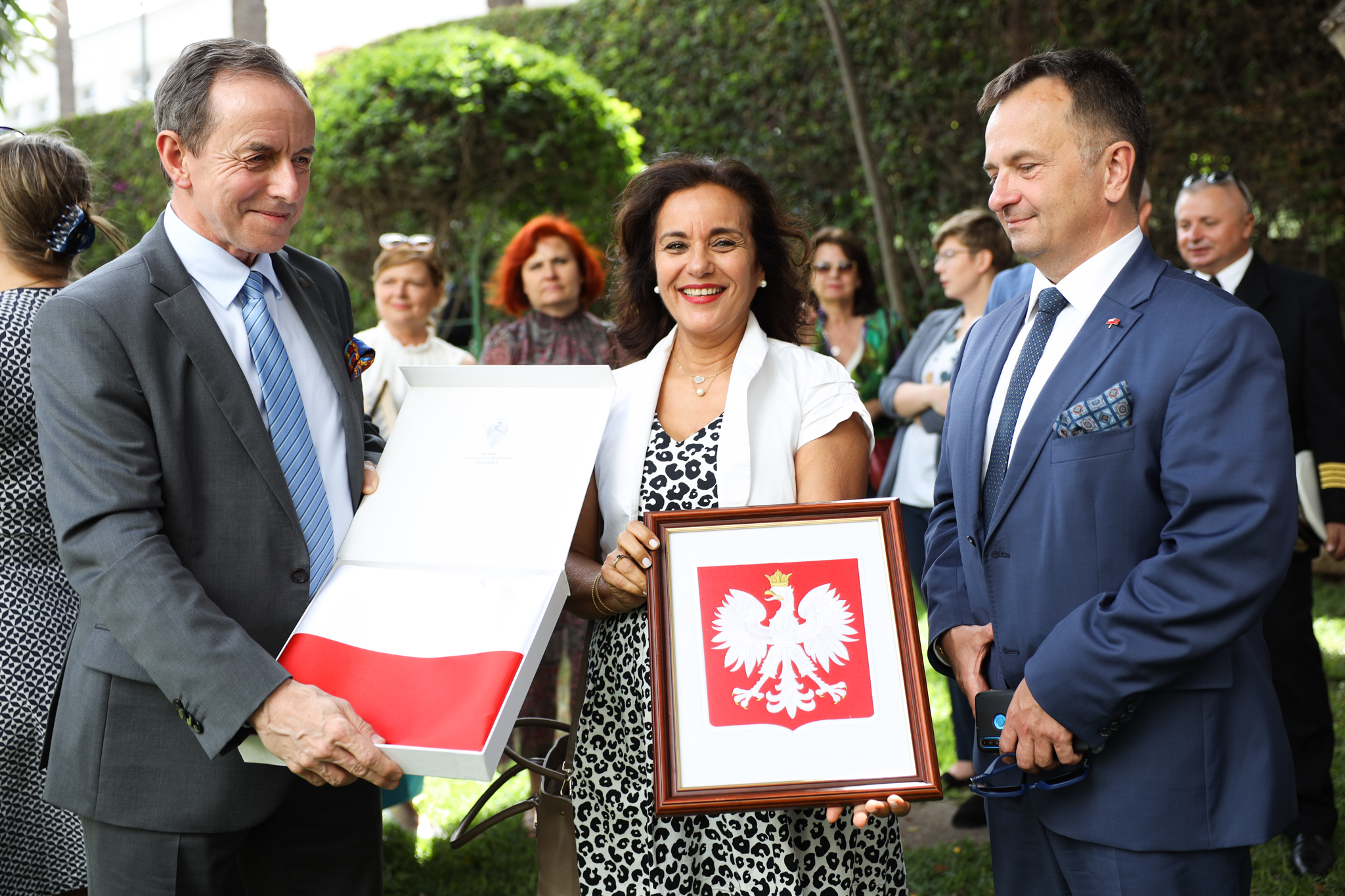 W byłej siedzibie Konsulatu Generalnego RP Pan Marszałek wraz z delegacją Senatu spotkali się z Polakami mieszkającymi w Maroku. Przy tej okazji Marszałek Senatu RP prof. Tomasz Grodzki wręczył flagę i godło przewodniczącej niedawno utworzonego Towarzystwa Przyjaźni Marokańsko-Polskiej, pani Nabili Essakalli.