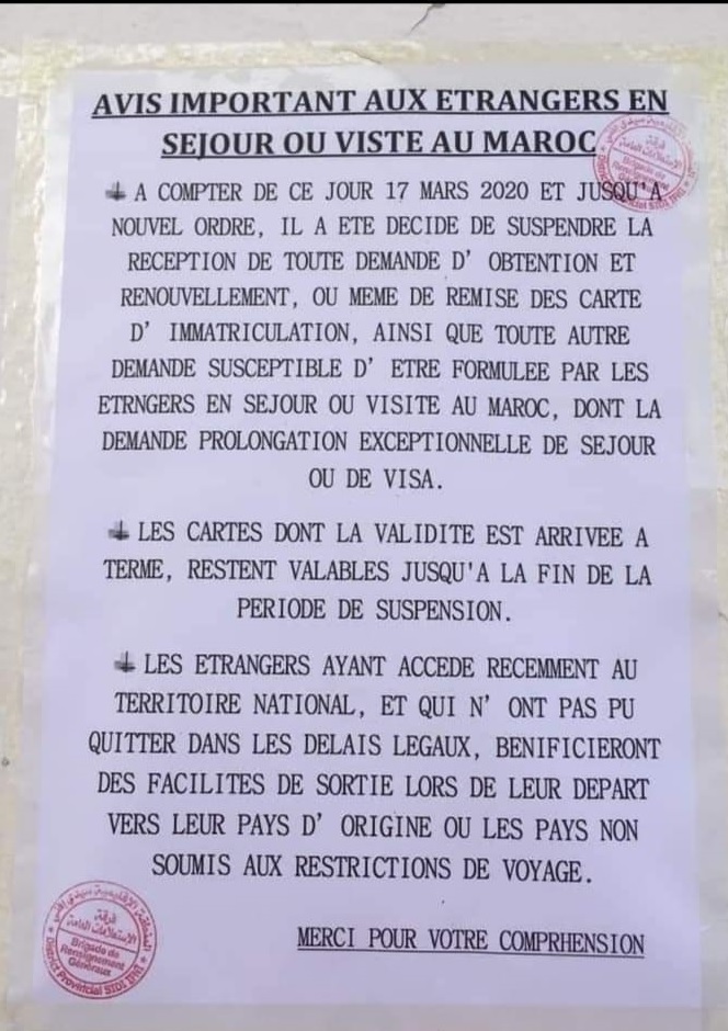 Generalna Dyrekcja Bezpieczeństwa Narodowego – DGSN (policja) postanowiła odroczyć od 18 marca na 15 dni (z możliwością przedłużenia), wyrabianie kart pobytu lub przedłużenie ich ważności, a także potwierdzenia złożenia wniosku o kartę pobytu.
