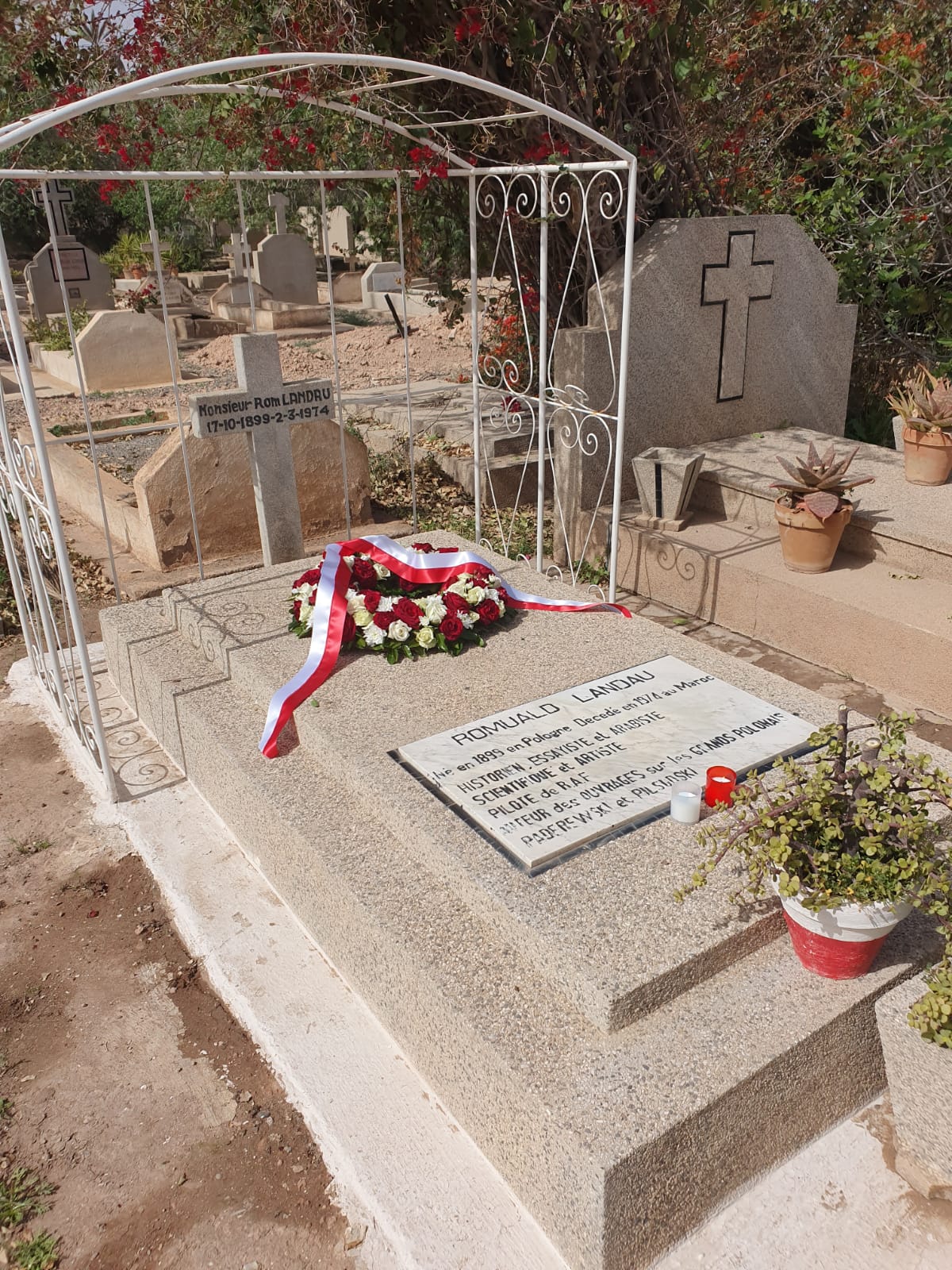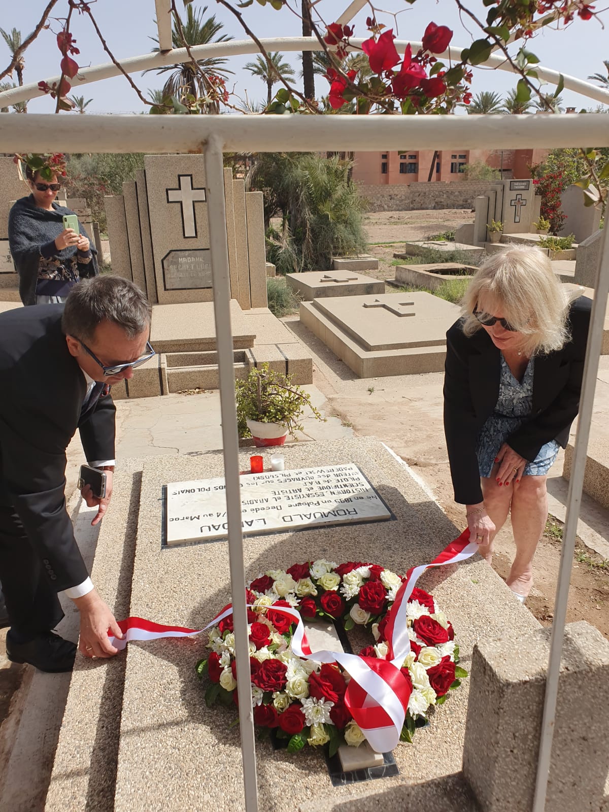 W setną rocznicę urodzin i pięćdziesiątą rocznicę śmierci Romualda "Roma" Landaua, wybitnego polsko-brytyjskiego artysty, dyplomaty, arabisty oraz autora wielu książek, Ambasador RP Krzysztof Karwowski wraz z wdową po jego bratanku p. Karen Gauthier-Landau oraz przedstawicielką miejscowej Polonii panią Moniką Markowicz-Baroudi, złożyli wieniec na jego grobie.
