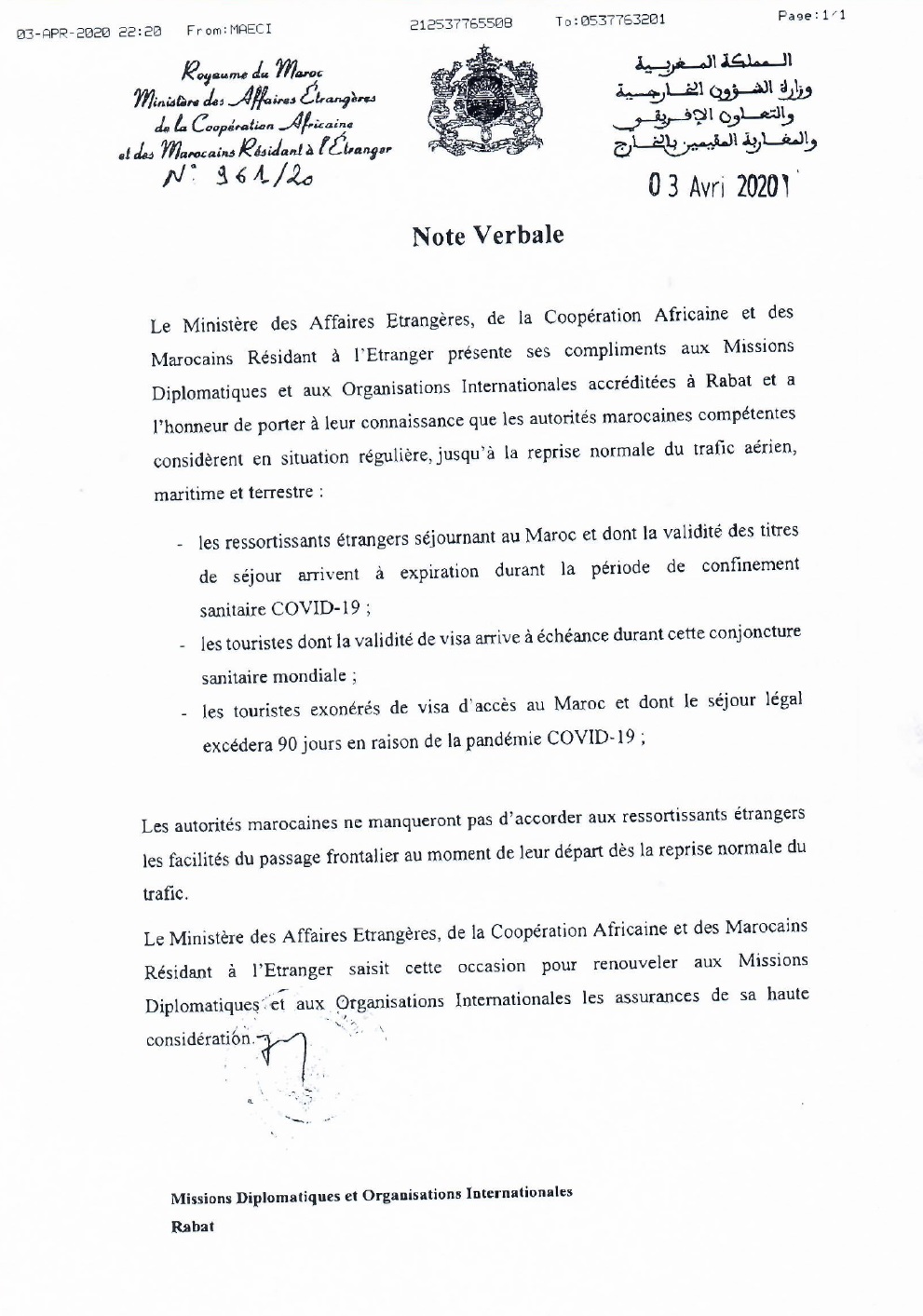 Władze Maroka informują, że do czasu wznowienia regularnego ruchu lotniczego, morskiego i drogowego, uznają za uregulowaną sytuację wszystkich obcokrajowców przebywających w Maroku, pomimo że ich dokument pobytu utracił ważność w trakcie okresu ograniczenia ruchu osobowego,