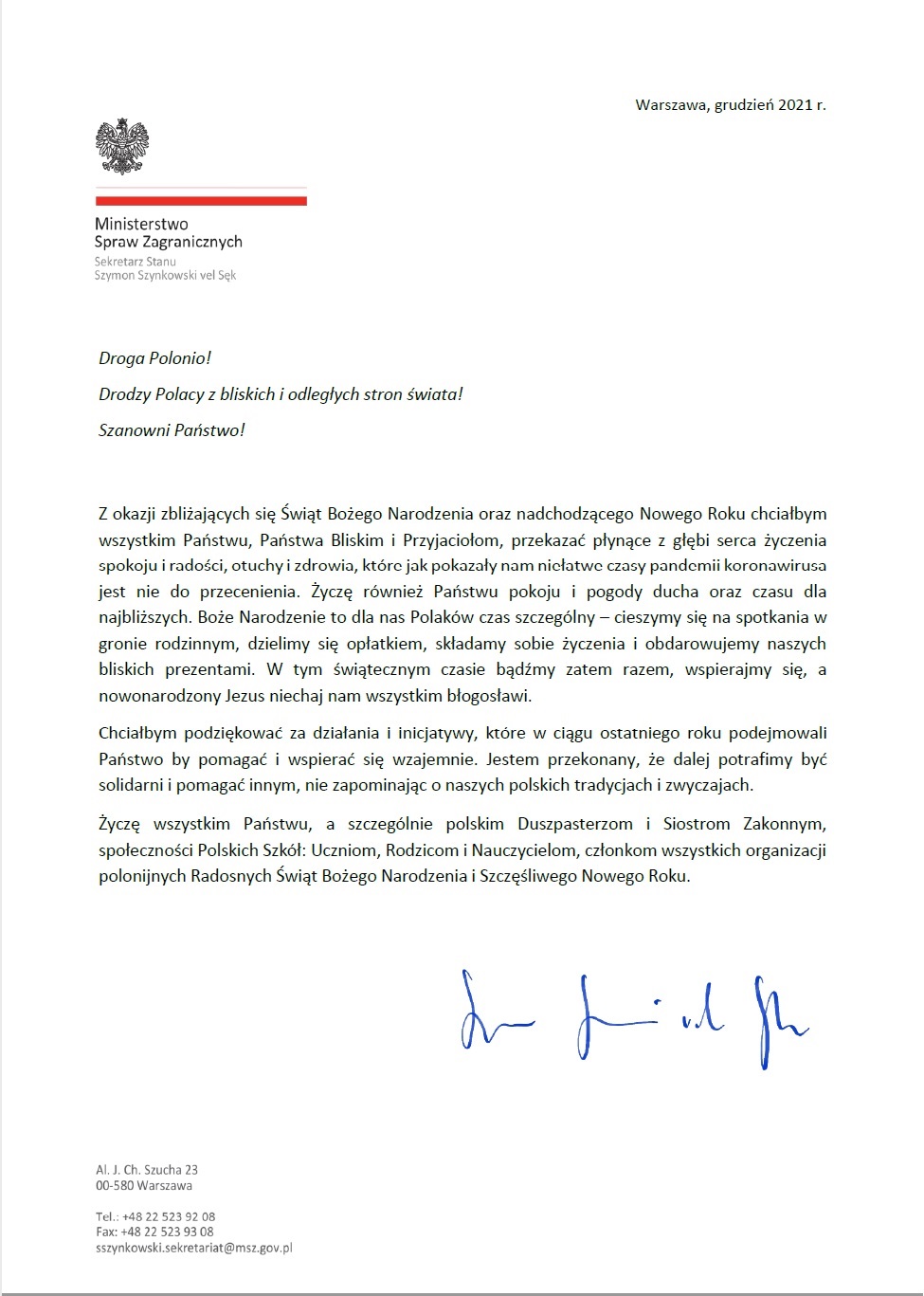 Życzę wszystkim Państwu, a szczególnie polskim Duszpasterzom i Siostrom Zakonnym, społeczności Polskich Szkół: Uczniom, Rodzicom i Nauczycielom, członkom wszystkich organizacji polonijnych Radosnych Świąt Bożego Narodzenia i Szczęśliwego Nowego Roku.
