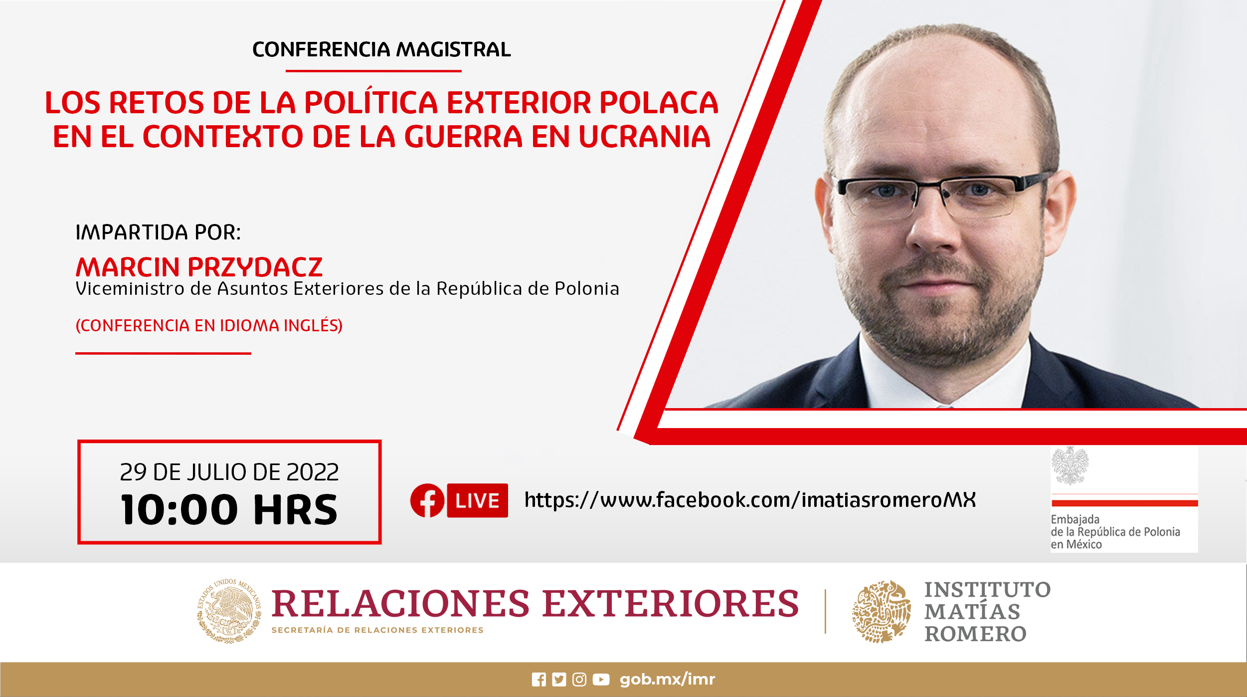 Los invitamos cordialmente a participar en la conferencia titulada LOS RETOS DE LA POLÍTICA EXTERIOR POLACA EN EL CONTEXTO DE LA GUERRA EN UCRANIA, impartida por Marcin Przydacz, Viceministro de Relaciones Exteriores de la República de Polonia.