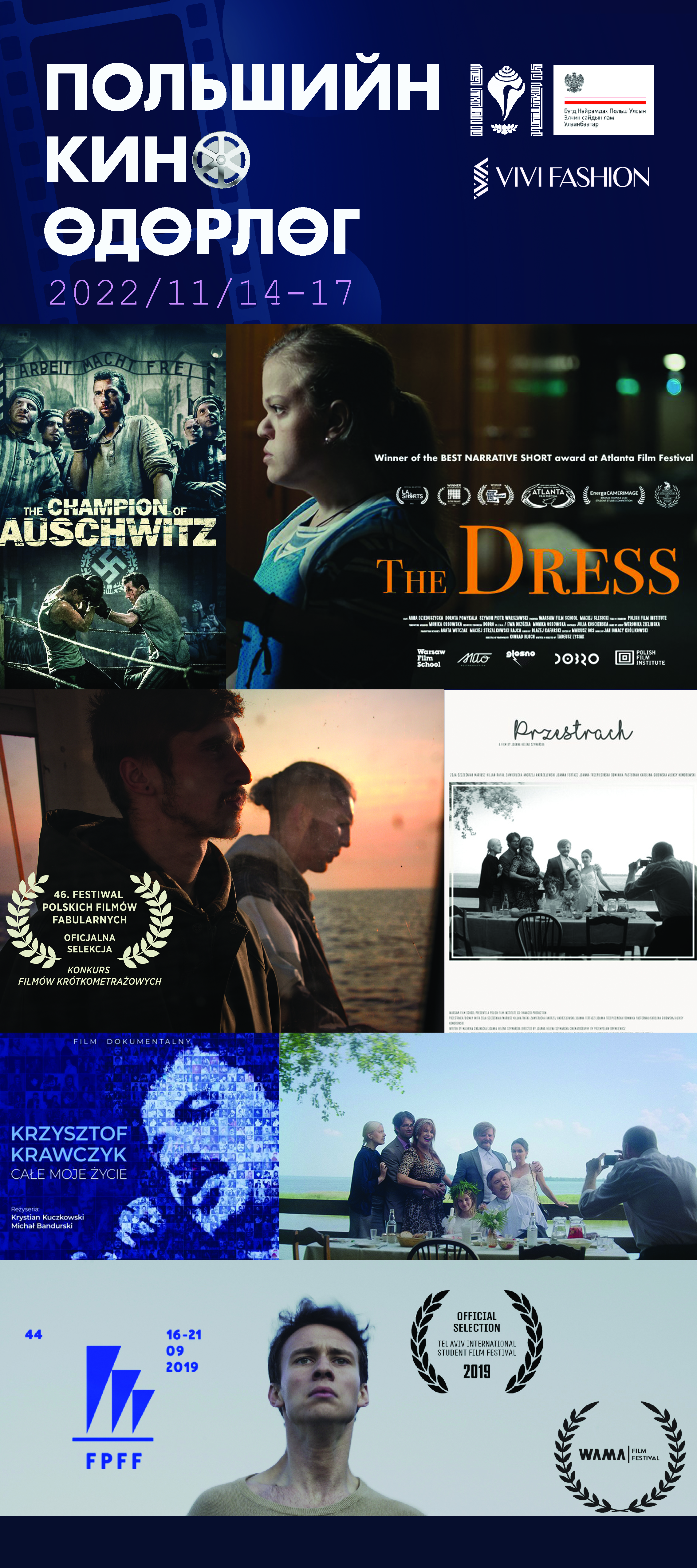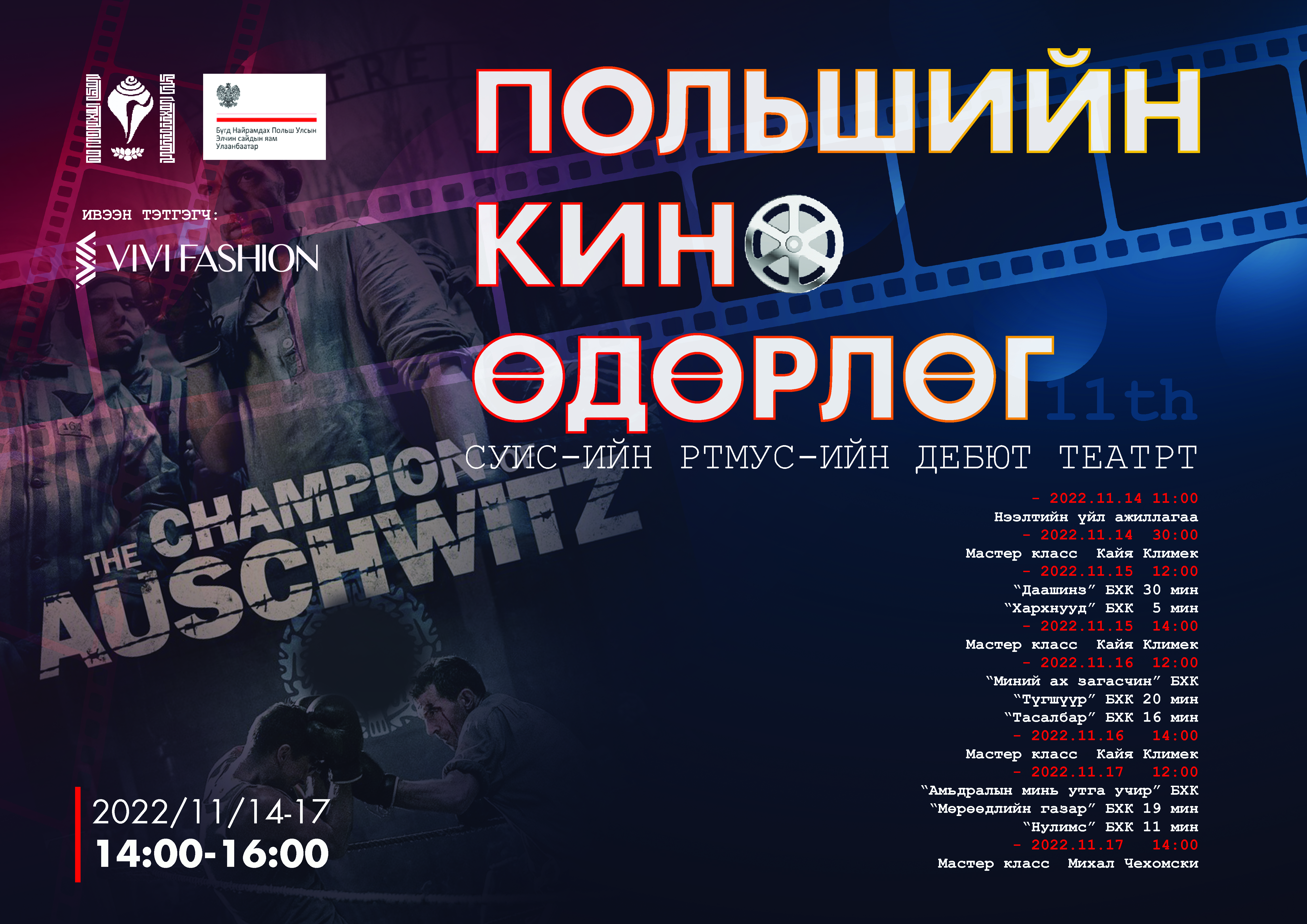 XI Dni Kina Polskiego w Ułan Bator zainaugurował film „Mistrz” Macieja Barczewskiego. W programie znalazły się także etiudy filmowe absolwentów Warszawskiej Szkoły Filmowej, w tym „Sukienka” Tadeusza Łysiaka, „Mój brat rybak” Alicji Sokół, „Przestrach” Joanny Szymańskiej i „Całe moje życie” Jędrzeja Górskiego. W ramach festiwalu odbywają się także warsztaty prowadzone przez polską krytyk filmową Kaję Klimek. Inaugurację Dni Kina Polskiego uświetnił występ z Anny Marii Jopek. Wydarzenie odbywa się w ramach cyklu imprez pt. „Polski Listopad w Ułan Bator”.