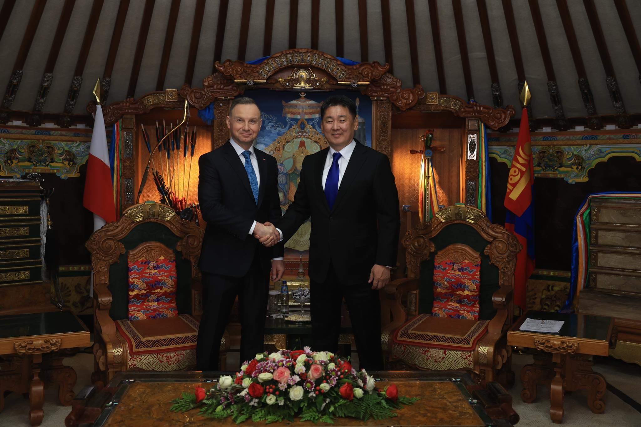 W dniach 24-26 kwietnia 2023 r. oficjalną wizytę w Mongolii złożył Prezydent Rzeczypospolitej Polskiej Andrzej Duda wraz z Małżonką Agatą Kornhauser-Dudą. Program wizyty obejmował rozmowy z Prezydentem U. Khürelsükhem, Premierem L. Oyun–Erdene oraz Przewodniczącym Wielkiego Churału Państwowego G. Zandanshatarem. Prezydent RP otworzył polsko-mongolskie forum biznesowe, spotkał się z Polakami mieszkającymi w Mongolii i mongolskimi absolwentami polskich uczelni. Wygłosił także wykład na Państwowym Uniwersytecie Mongolskim, gdzie został wyróżniony tytułem doktora honoris-causa. W trakcie wizyty Prezydent RP wraz z Minister Spraw Zagranicznych Mongolii B. Battsetseg dokonali również otwarcia nowej siedziby Ambasady RP w Ułan Bator. Była to pierwsza wizyta polskiego prezydenta w Mongolii od 10 lat.