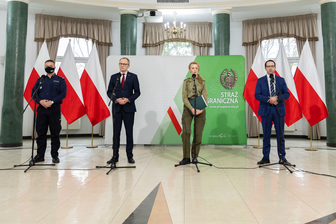 – ‘We have worked out principles that will guarantee safety for journalists reporting on events from the border, and help maintain the safety of formations subordinate to the Ministry of the Interior and Administration and the Polish Armed Forces,’ said Deputy Minister Błażej Poboży during a press conference at the headquarters of the Border Guard. Today's (1 December) conference was also attended by Lieutenant Anna Michalska – a press officer of the Border Guard Headquarters, Stanisław Żaryn – a press officer of the Minister Coordinator of Special Services and Inspector Mariusz Ciarka – a press officer of the Police Headquarters.