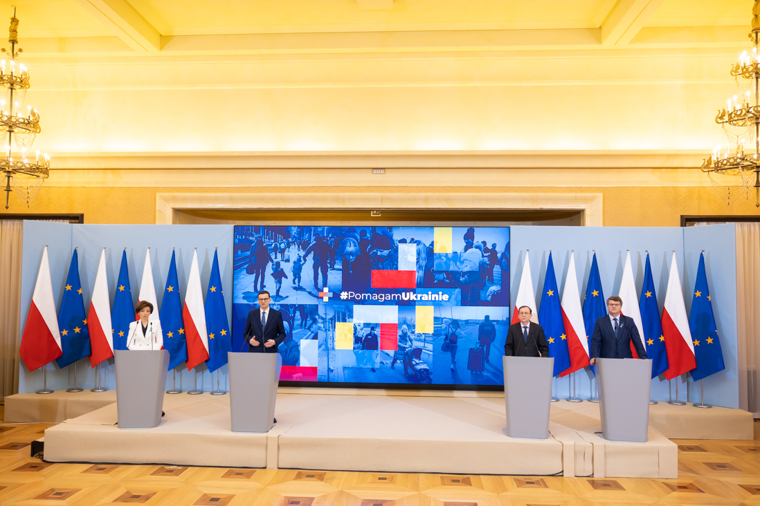 Під час прес-конференції Голова Ради міністрів М. Моравецький, Маріуш Камінський – міністр внутрішніх справ і адміністрації, Марлена Мальонг – міністр у справах сім’ї та соціальної політики, а також Мацєй Вонсік – заступник міністра в МВСіА представили вирішення, викладені у спеціальному законі присвяченому питанням надання допомоги громадянам України у зв’язку з російською агресією проти їхньої держави.