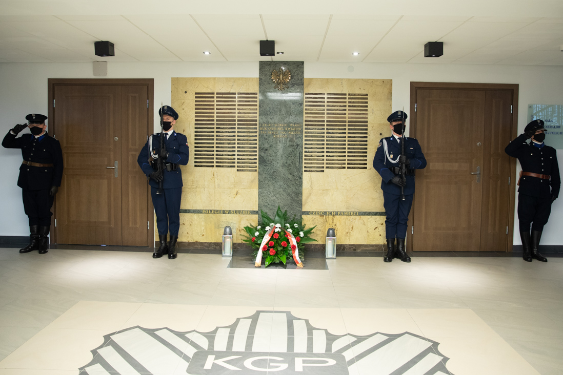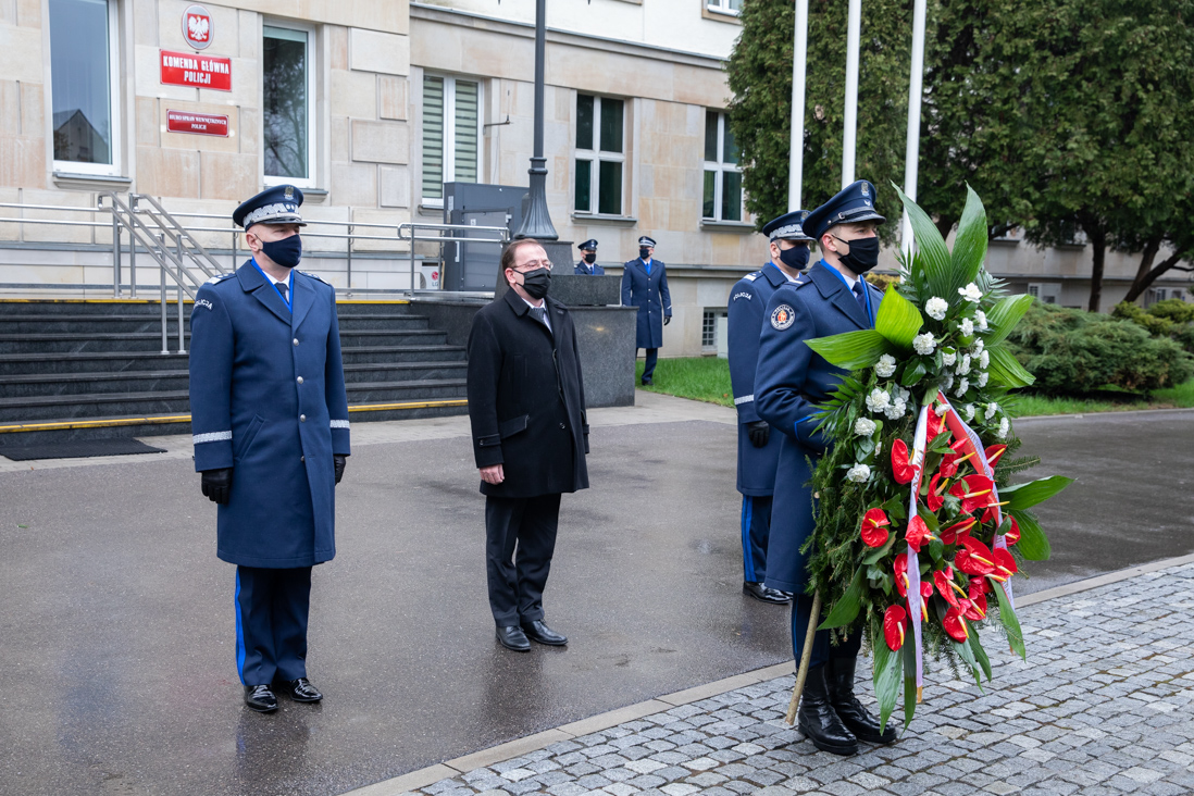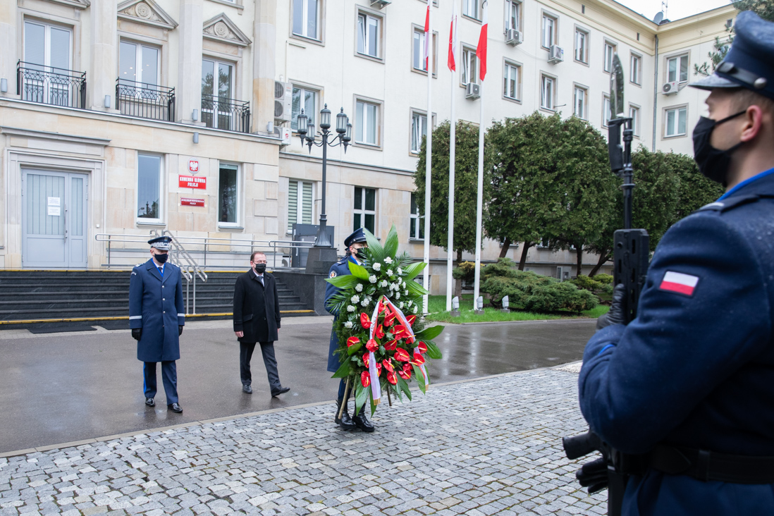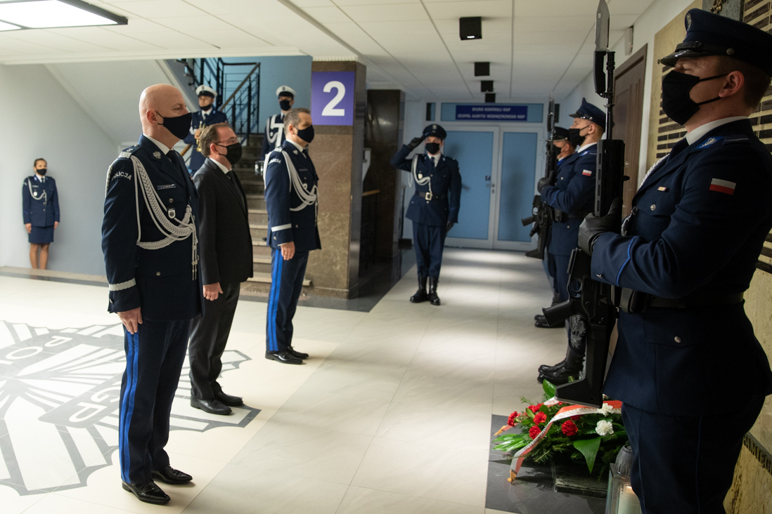 Minister Mariusz Kamiński we wtorek (13 kwietnia br.) uczcił pamięć ofiar Zbrodni Katyńskiej. Szef MSWiA złożył kwiaty przy obelisku „Poległym Policjantom – Rzeczpospolita Polska” na dziedzińcu Komendy Głównej Policji i pod Tablicą Pamięci w siedzibie KGP. Ministrowi towarzyszył gen. insp. Jarosław Szymczyk, Komendant Główny Policji.