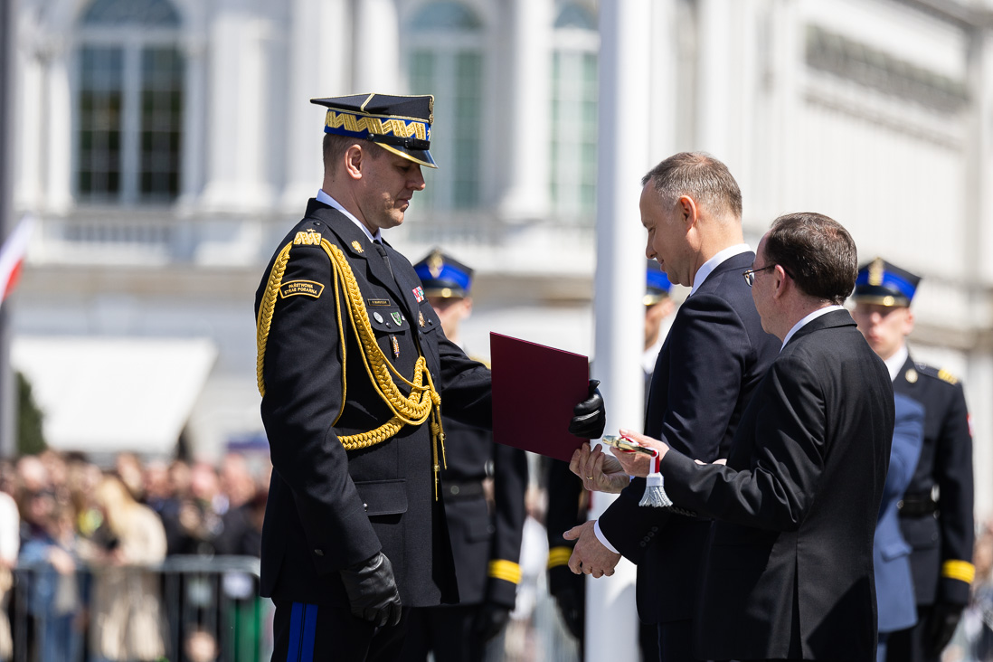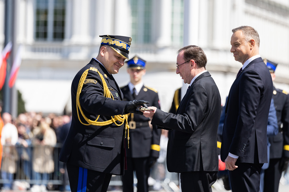 Prezydent Andrzej Duda wręczył również odznaczenia państwowe za wybitne zasługi dla ochrony przeciwpożarowej i za działalność społeczną. Krzyżem Kawalerskim Orderu Odrodzenia Polski został odznaczony komendant główny PSP gen. brygadier Andrzej Bartkowiak. Srebrny Krzyż Zasługi odebrał zastępca komendanta głównego PSP nadbryg. Krzysztof Hejduk, a st. bryg. Adam Krasuski otrzymał Brązowy Krzyż Zasługi.