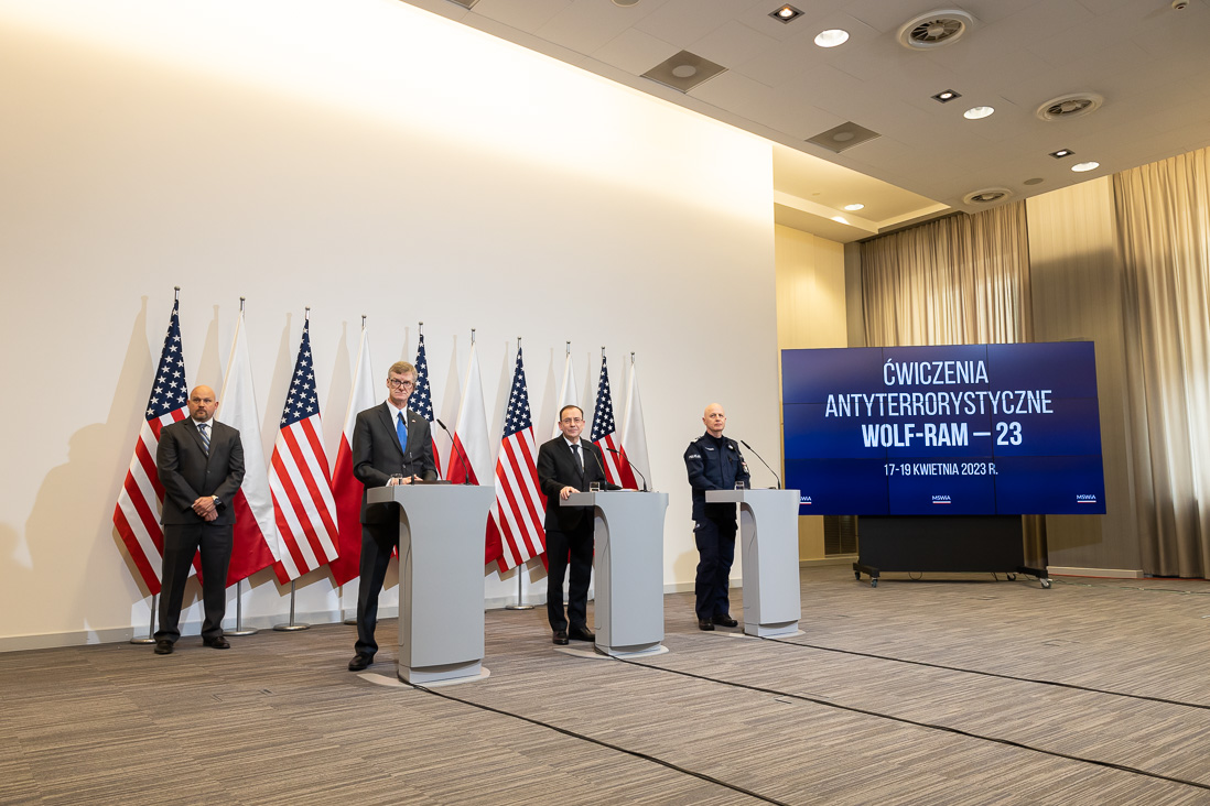 We wtorek, 18 kwietnia br. odbyła się konferencja prasowa ministra Mariusza Kamińskiego oraz komendanta głównego Policji gen. insp. Jarosława Szymczyka. W wydarzeniu wziął także udział Daniel Lawton, zastępca szefa misji ambasady Stanów Zjednoczonych w Polsce. Tematem konferencji było ćwiczenie „Wolf-Ram-23”.