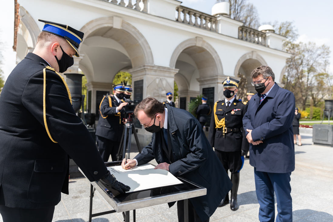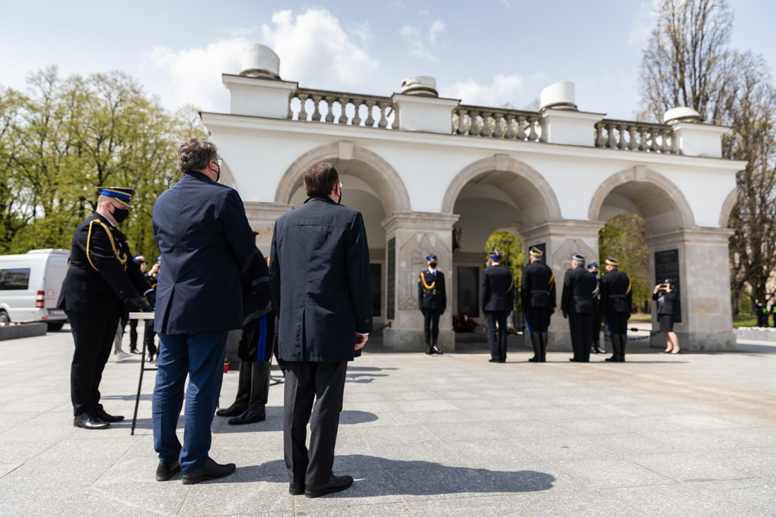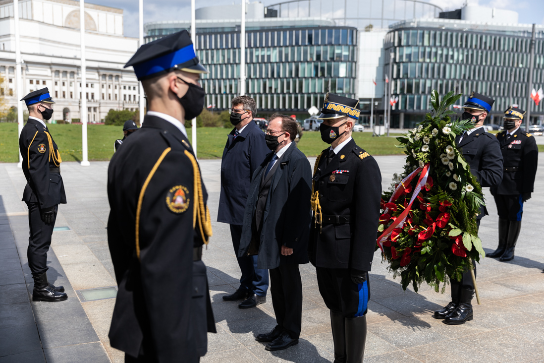 We wtorek (4 maja br.) odbyły się obchody Dnia Strażaka. Minister Mariusz Kamiński i wiceminister Maciej Wąsik wraz z komendantem głównym Państwowej Straży Pożarnej nadbryg. Andrzejem Bartkowiakiem złożyli wieniec na płycie Grobu Nieznanego Żołnierza na Placu Marszałka Józefa Piłsudskiego w Warszawie. Następnie wiceminister Maciej Wąsik wziął udział w uroczystym apelu z okazji wręczenia dyplomów ukończenia studiów oraz promocji oficerskiej w Szkole Głównej Służby Pożarniczej.