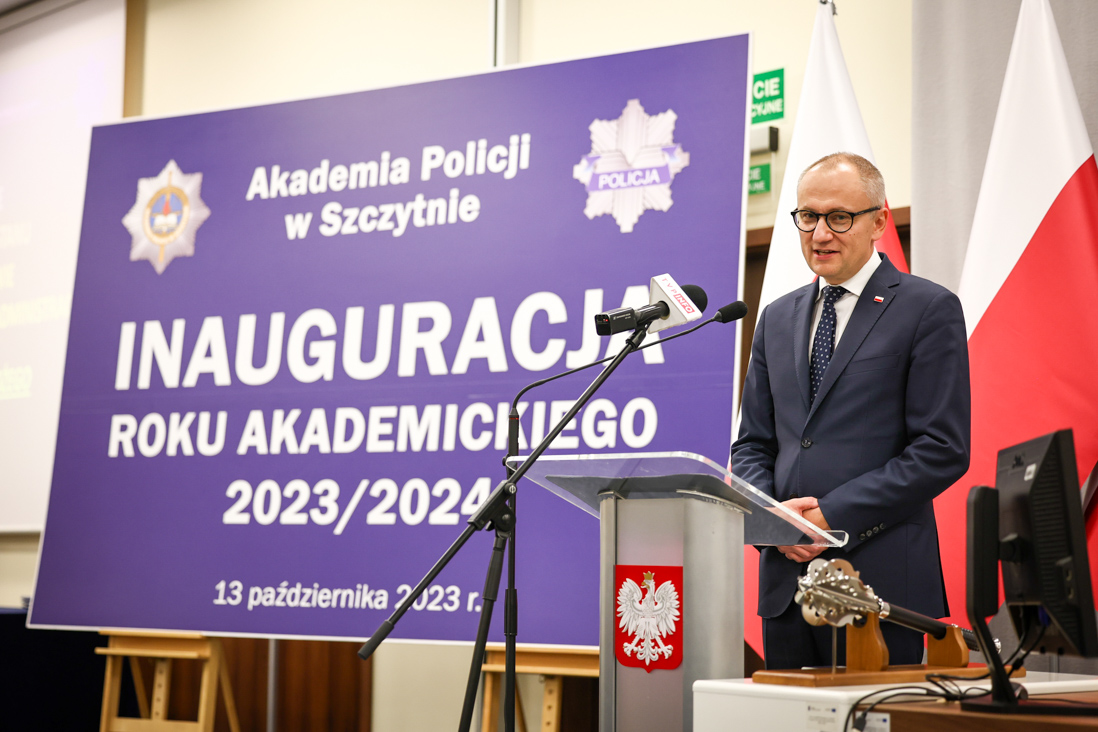 W piątek, 13 października br. odbyła się inauguracja roku akademickiego 2023/2024 w Akademii Policji w Szczytnie, w której uczestniczył wiceminister Błażej Poboży. To pierwsze rozpoczęcie roku akademickiego po zmianie nazwy uczelni. W uroczystości wzięli udział także Komendant Główny Policji gen. insp. Jarosław Szymczyk oraz Komendant-Rektor Akademii Policji w Szczytnie nadinsp. dr hab. Iwona Klonowska.