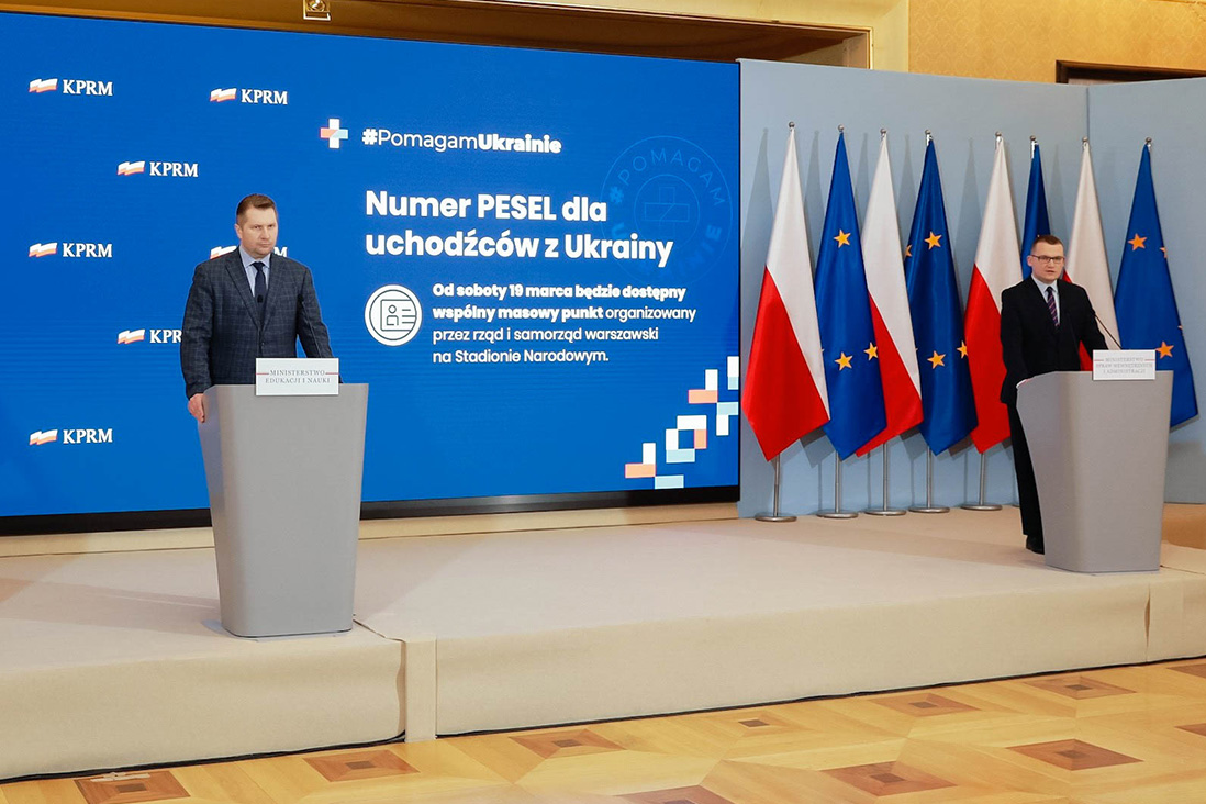 - Od początku działania systemu rejestracji, czyli od środy do dziś do godz. 15:00 123 tysiące uchodźców z Ukrainy otrzymało numer PESEL. Dziś wojewodowie otrzymali środki z Funduszu Pomocy i mam meldunki z pierwszych województw, że wypłaty do samorządów zostały zlecone - poinformował wiceminister Paweł Szefernaker w piątek 18 marca br. W konferencji prasowej, która odbyła się w KPRM, wzięli też udział: Przemysław Czarnek, minister edukacji i nauki oraz Piotr Müller, rzecznik rządu.