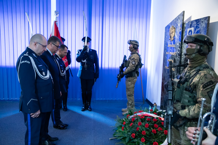 Wiceszef resortu spraw wewnętrznych i administracji wraz z insp. Tomaszem Szymańskim, Zastępcą Komendanta Głównego Policji oraz mł. insp. Dariuszem Ziębą, dowódcą CPKP BOA złożyli wieniec pod tablicą pamięci w siedzibie Centralnego Pododdziału Kontrterrorystycznego Policji BOA.