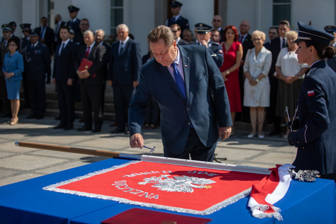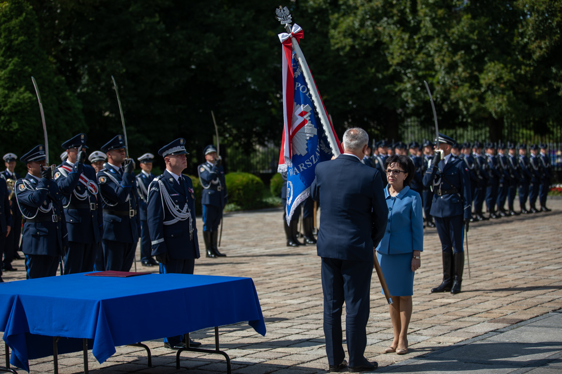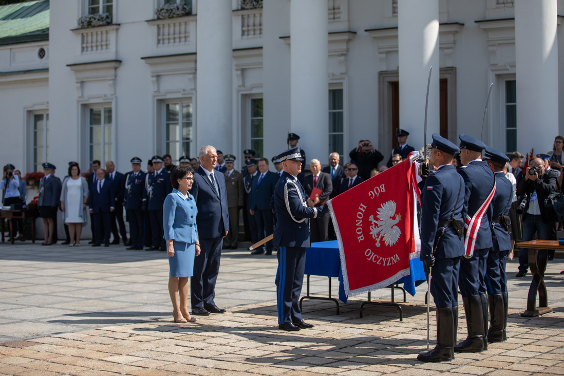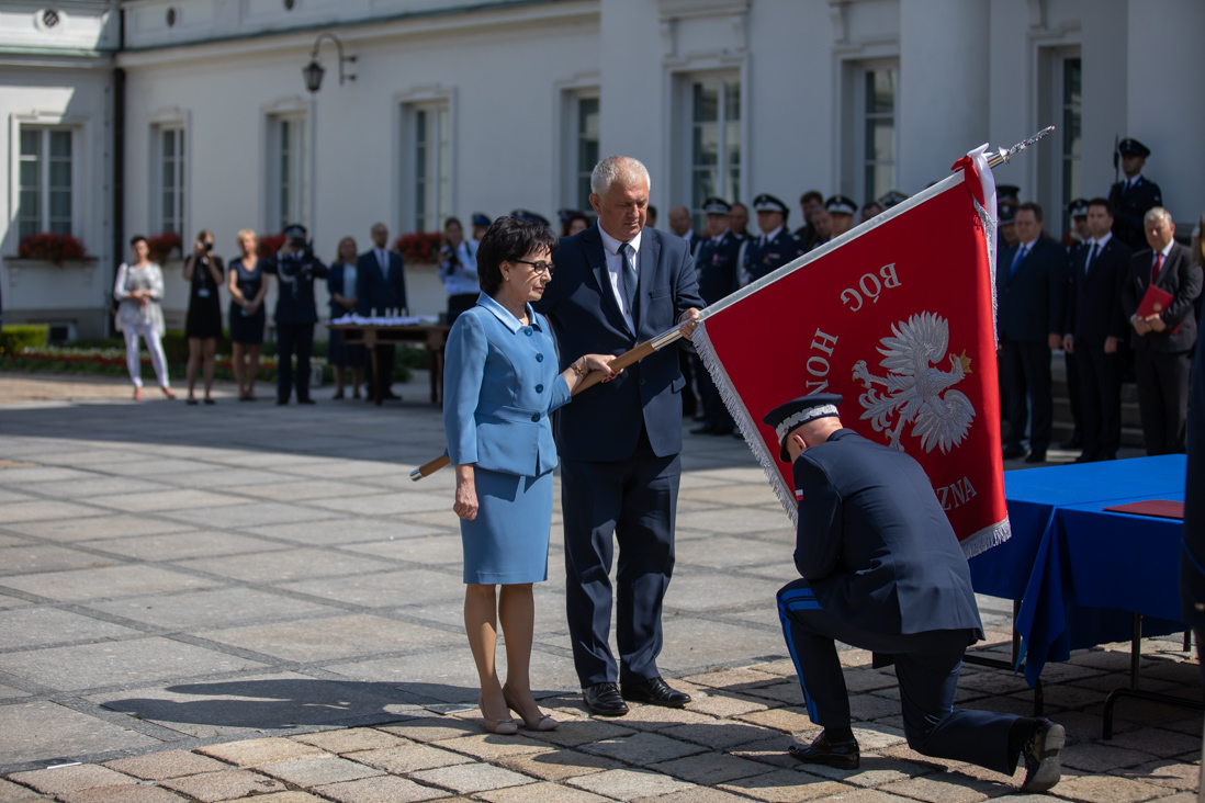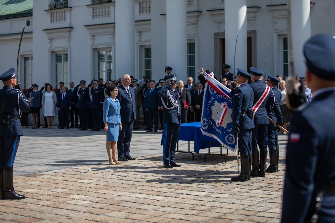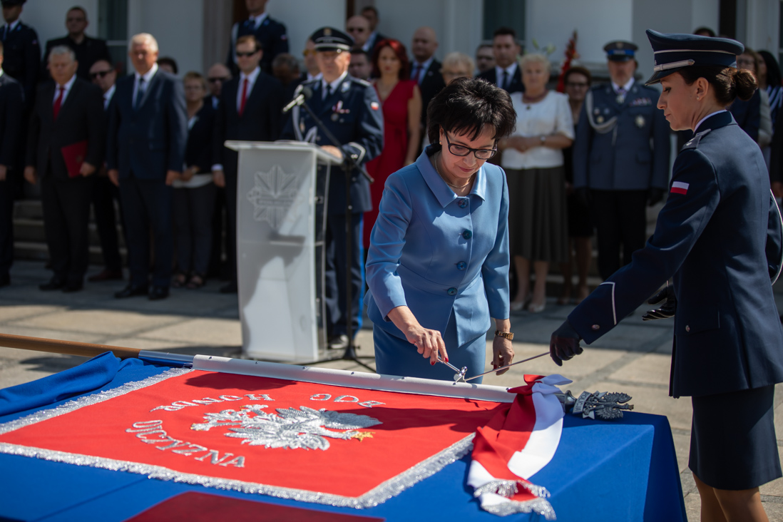 Podczas uroczystości w Belwederze, Komenda Główna Policji otrzymała dziś (26 lipca 2019 r.) nowy sztandar. - Dziękuję za to, że na sztandarze pojawiły się znowu słowa: Bóg, Honor, Ojczyzna. Wracamy do korzeni i tradycji. Wracamy do wartości, na których chcemy budować bezpieczne państwo – powiedziała minister Elżbieta Witek.