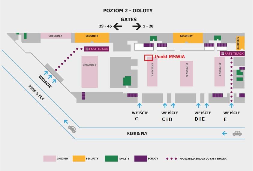 Lotniska Chopina, Warszawa ul. Żwirki i Wigury 1 Terminal „A”, szczyt wyspy „C” od strony wejścia do strefy kontroli bezpieczeństwa CDE.