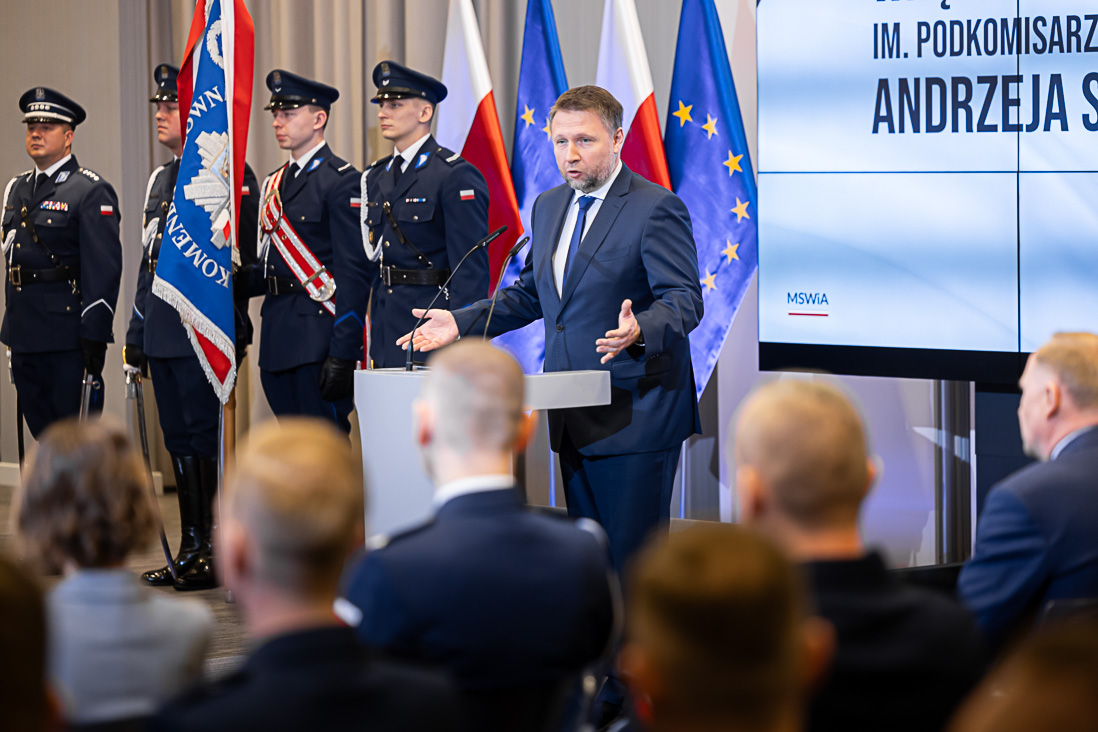 Minister spraw wewnętrznych i administracji mówił też o czynach, za które funkcjonariusze zostali dzisiaj odznaczeni. Przywołał m.in. historie policjantów, którzy ratowali ludzi z pożarów, a także dramatyczne zdarzenie z Poznania, gdzie policjantka zatrzymała nożownika, który zaatakował 5-letniego chłopca.