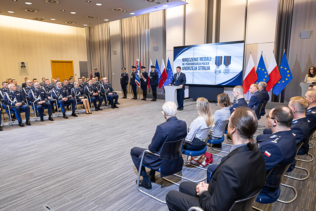 W czwartek, 15 lutego 2024 r. minister Marcin Kierwiński wręczył 58 policjantkom i policjantom medale im. podkomisarza Policji Andrzeja Struja. Te wyjątkowe odznaczenia otrzymali funkcjonariusze z całego kraju, którzy z narażeniem własnego zdrowia i życia, ratowali innych. Gośćmi honorowymi uroczystości były wdowa po zmarłym policjancie pani Anna Struj wraz z córką panią Moniką Struj.