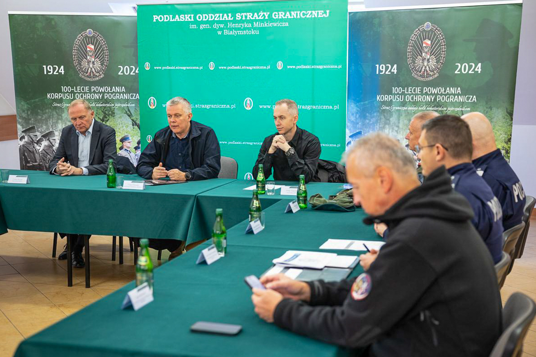 Dziś, 17 października br., minister Tomasz Siemoniak wziął udział w konferencji prasowej przy granicy polsko-białoruskiej. Wcześniej, w Podlaskim Oddziale Straży Granicznej w Mielniku szef MSWiA uczestniczył w odprawie dotyczącej operacji „Bezpieczne Podlasie”. W wydarzeniu wzięli także udział wiceminister Czesław Mroczek, wiceszef MON Cezary Tomczyk, a także przedstawiciele Straży Granicznej, Policji oraz wojska.