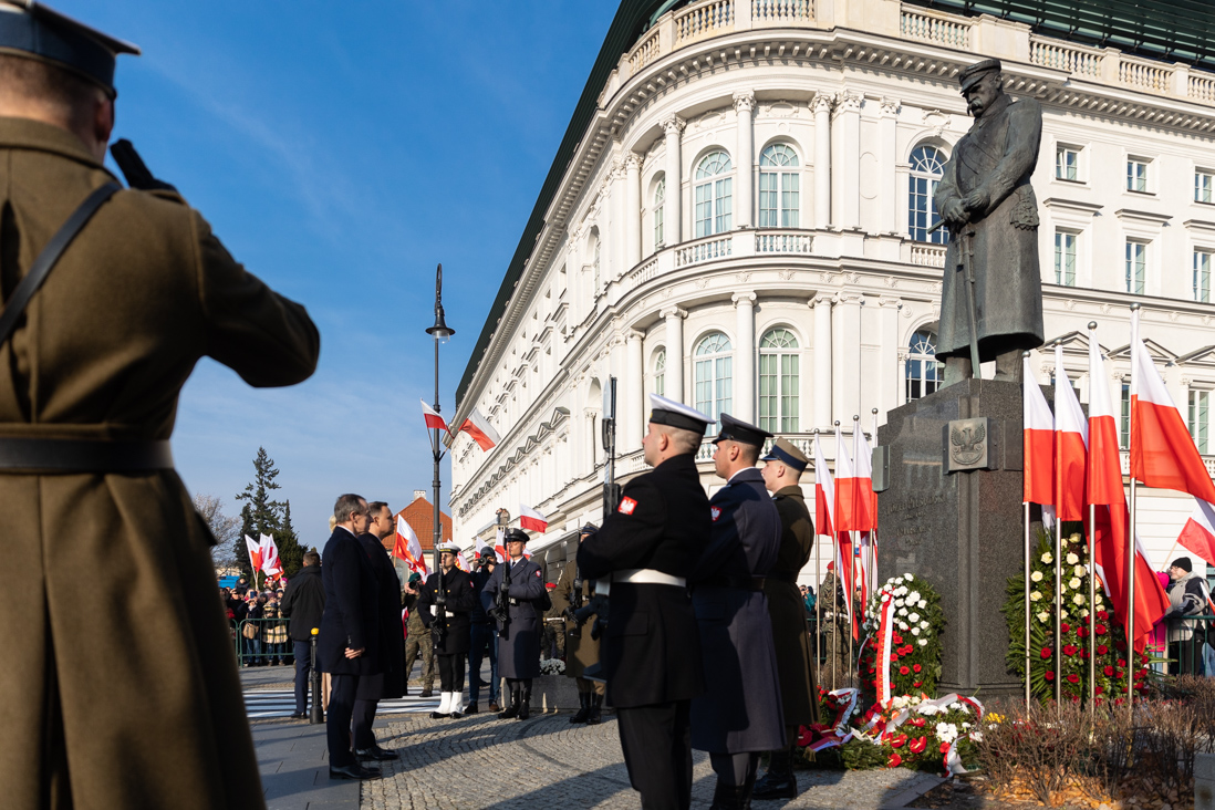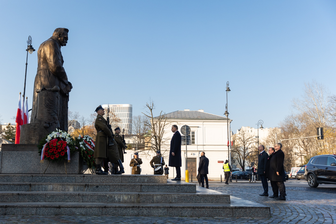 Przed uroczystością wręczenia nominacji generalskich prezydent Andrzej Duda, minister Mariusz Kamiński, szef BBN Paweł Soloch oraz minister Wojciech Kolarski złożyli wieniec przed pomnikiem Marszałka Józefa Piłsudskiego.