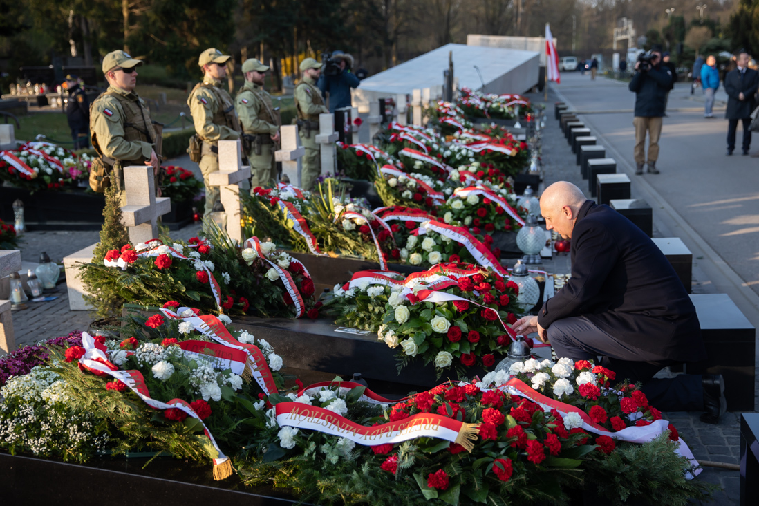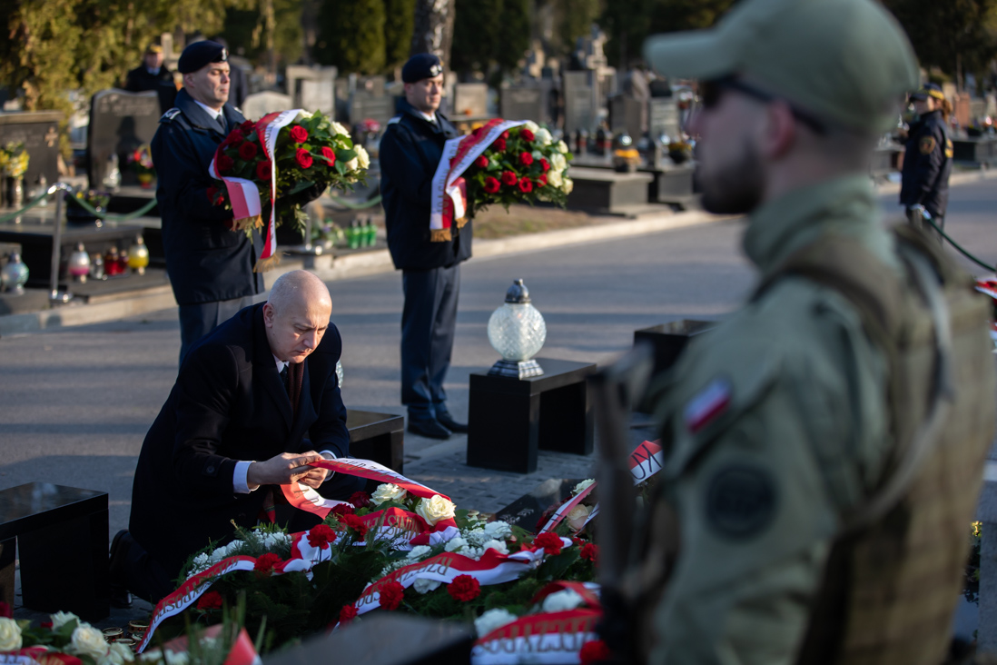 Rano o godz. 7.00, szef MSWiA złożył kwiaty przy Kwaterze Smoleńskiej na Cmentarzu Wojskowym na Powązkach. Zostało tam pochowanych 28 ofiar tragedii, między innymi śp. Władysław Stasiak, były minister spraw wewnętrznych i administracji. Joachim Brudziński oddał także hołd spoczywającym w tym miejscu śp. mjr. Dariuszowi Michałowskiemu, kpt. Pawłowi Janeczkowi, por. Piotrowi Noskowi i ppor. Jackowi Surówce - funkcjonariuszom Biura Ochrony Rządu, którzy zginęli na służbie. Na grobach pozostałych funkcjonariuszy BOR: śp. płk. Jarosława Florczaka, ppor. Agnieszki Pogródki - Węcławek, ppor. Artura Francuza, ppor. Pawła Krajewskiego i ppor. Marka Uleryka, kwiaty złożyły delegacje SOP.