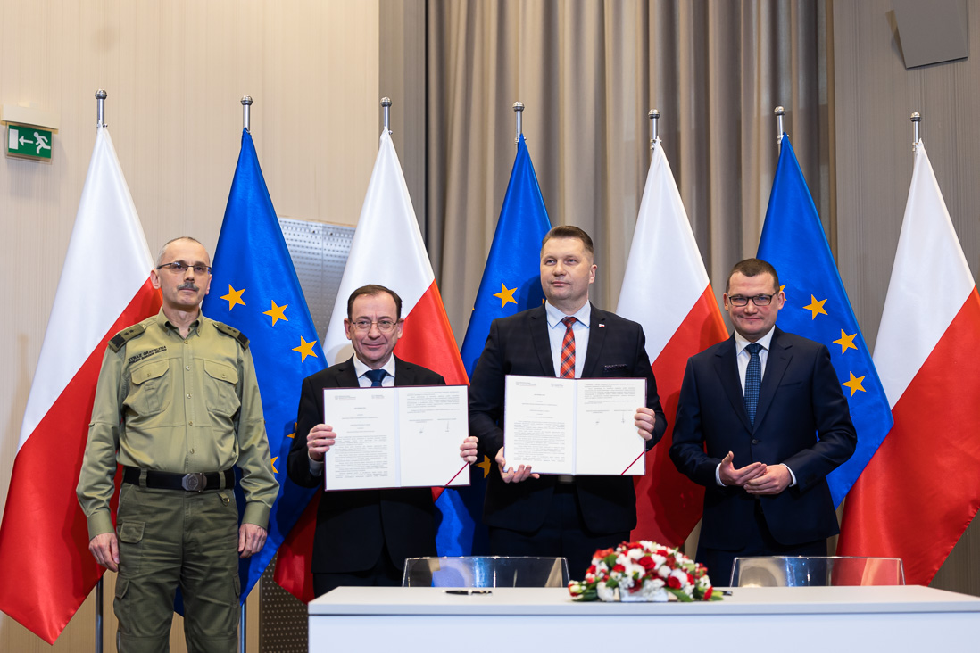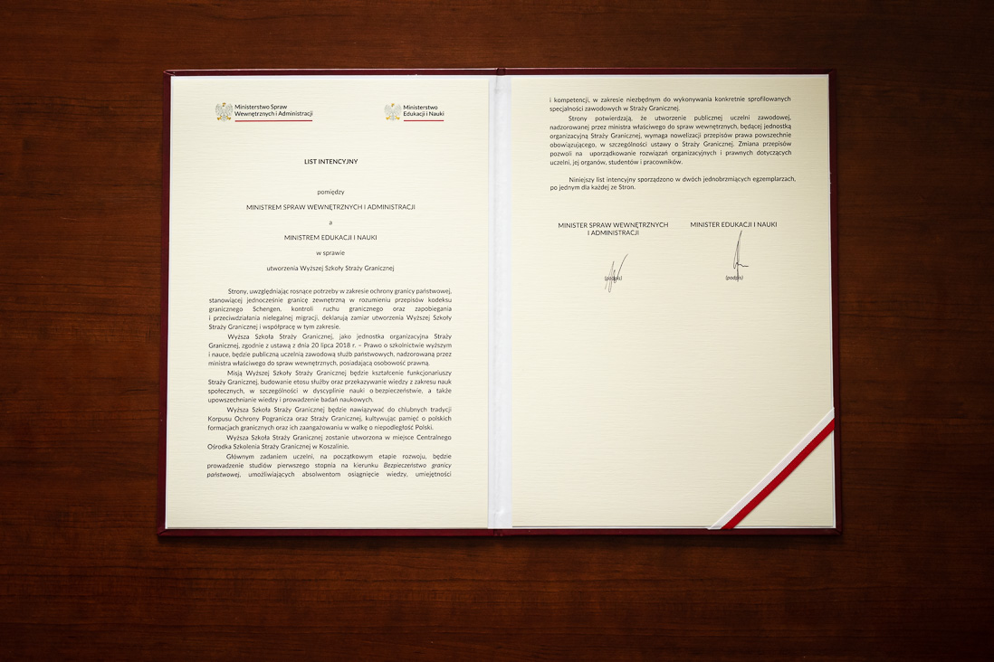 W czwartek, 23 marca br. Minister Spraw Wewnętrznych i Administracji Mariusz Kamiński oraz Minister Edukacji i Nauki Przemysław Czarnek podpisali list intencyjny w sprawie utworzenia Wyższej Szkoły Straży Granicznej. W uroczystości wzięli też udział Sekretarz stanu w MSWiA Paweł Szefernaker oraz Komendant Główny Straży Granicznej gen. dyw. SG Tomasz Praga.