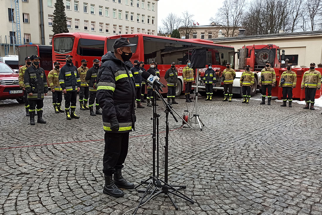 O godz. 14:00 z kolei, na terenie Szkoły Aspirantów PSP w Krakowie, odbyła się odprawa z przygotowującymi się do wyjazdu strażakami. To grupa 66 strażaków PSP, w tym 59 ratowników medycznych. W odprawie wziął udział wojewoda małopolski Łukasz Kmita oraz małopolski komendant wojewódzki PSP st. bryg. Piotr Filipek.