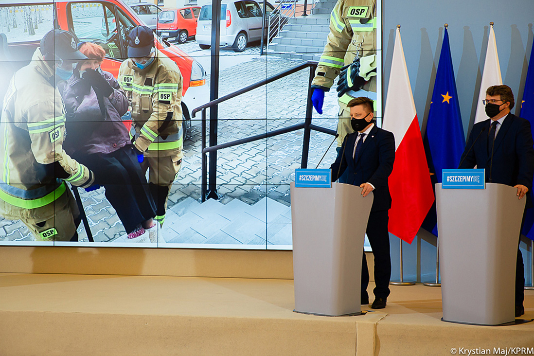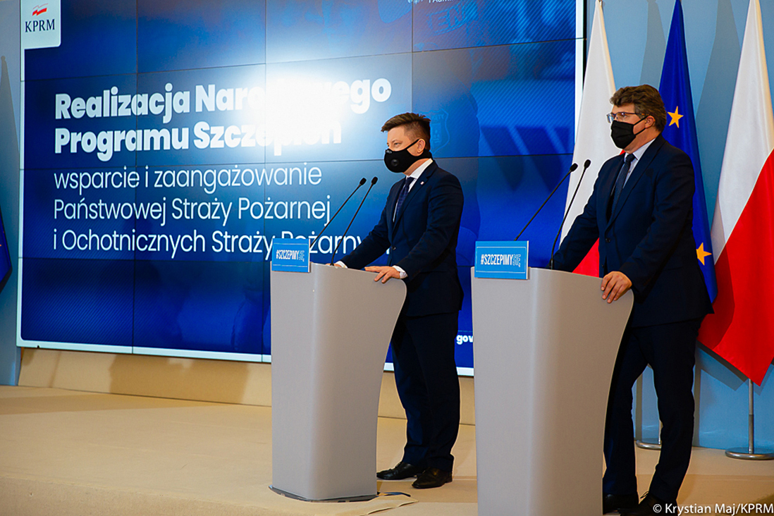 – Niezwykle ważnym aspektem realizacji Narodowego Programu Szczepień jest współpraca z samorządami, Państwową Strażą Pożarną i Ochotniczą Strażą Pożarną w zakresie działań w terenie oraz dowozu osób z ograniczoną samodzielnością do punktów szczepień – powiedział podczas konferencji Michał Dworczyk, szef KPRM. Jak dodał, współpraca OSP, PSP i samorządów rozwija się bardzo dobrze. – Bez zaangażowania tysięcy osób dobrej woli, strażaków, druhów i druhen oraz bez wsparcia MSWiA realizacja Narodowego Programu Szczepień byłaby niemożliwa – podkreślił minister Michał Dworczyk.