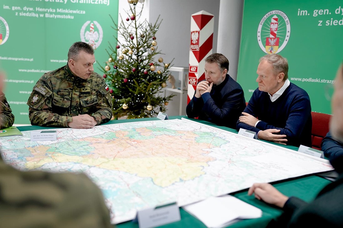 Premier Donald Tusk wraz z Ministrem Spraw Wewnętrznych i Administracji Marcinem Kierwińskim spotkali się z funkcjonariuszami Straży Granicznej i żołnierzami w Bobrownikach, aby złożyć im życzenia świąteczne i wyrazić uznanie dla ich pracy. „Chciałbym, żeby przy wigilijnym stole wszyscy rodacy pamiętali o tych, którzy tego wieczora i w kolejne świąteczne dni będą chronili naszą granicę” - powiedział Prezes Rady Ministrów. Zapewnił też o szczelności granicy, do czego przyczyniły się m.in. nowe wieże obserwacyjne i drony. Zapowiedział również 2,5 mld zł na kolejne inwestycje w bezpieczeństwo granicy wschodniej.