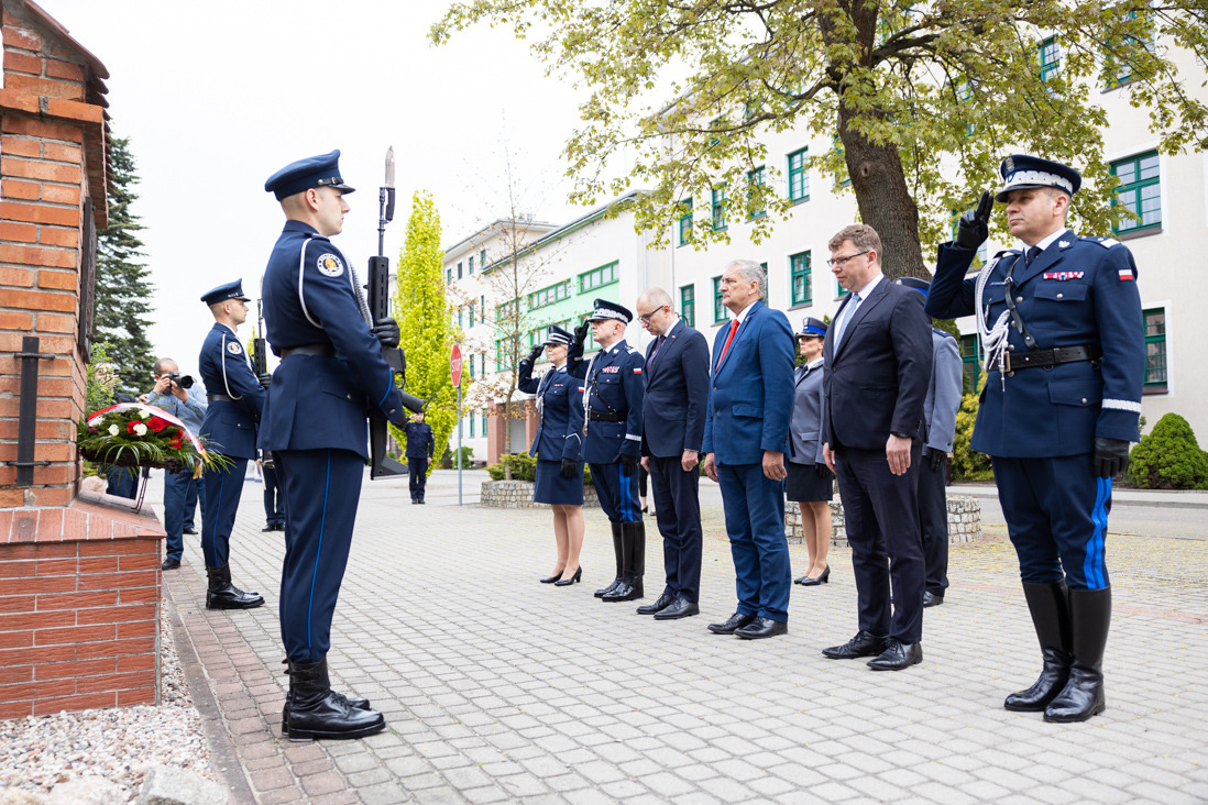 Przed rozpoczęciem uroczystości wiceminister Błażej Poboży oraz gen. insp. Jarosław Szymczyk, komendant główny Policji złożyli kwiaty przed tablicą upamiętniającą policjantów zamordowanych w Kalininie.