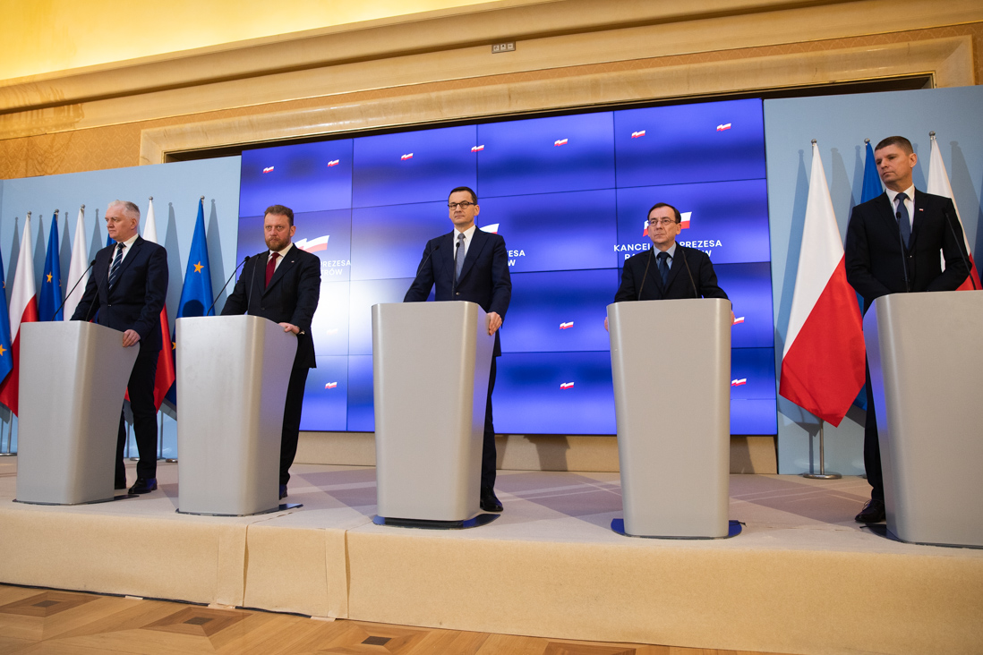 Konferencję poprzedziło posiedzenie Rządowego Zespołu Zarządzania Kryzysowego. Wzięli w nim udział m.in. Jarosław Gowin – wicepremier i minister nauki i szkolnictwa wyższego, Łukasz Szumowski – minister zdrowia, Mariusz Kamiński – minister spraw wewnętrznych i administracji, Dariusz Piontkowski – minister edukacji narodowej oraz Paweł Szefernaker – wiceminister spraw wewnętrznych i administracji.